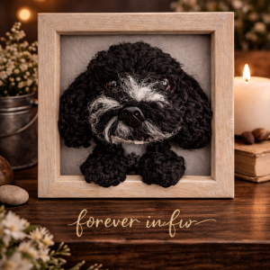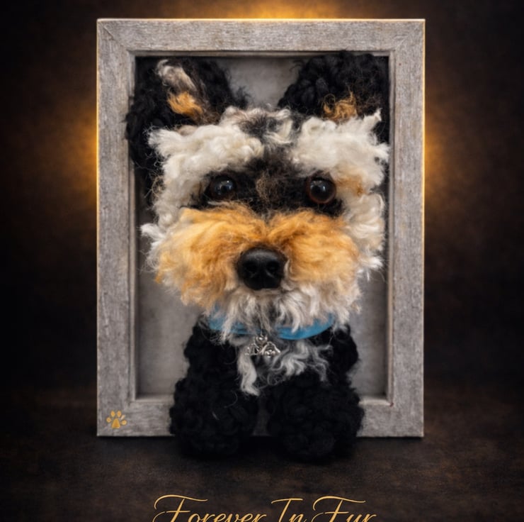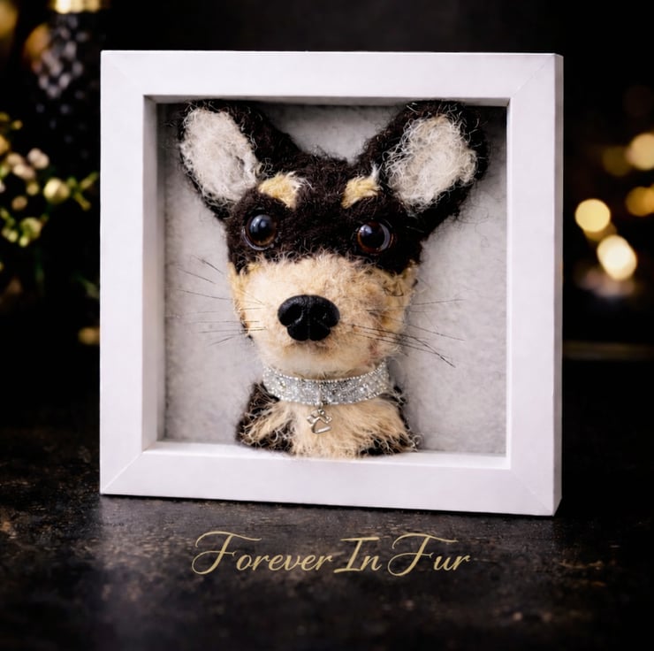 Each portrait is carefully handcrafted using traditional needle felting techniques to create a miniature sculpture inspired by your pet. The finished replica is mounted inside a frame to create a unique three-dimensional portrait that captures the character and markings of your dog.