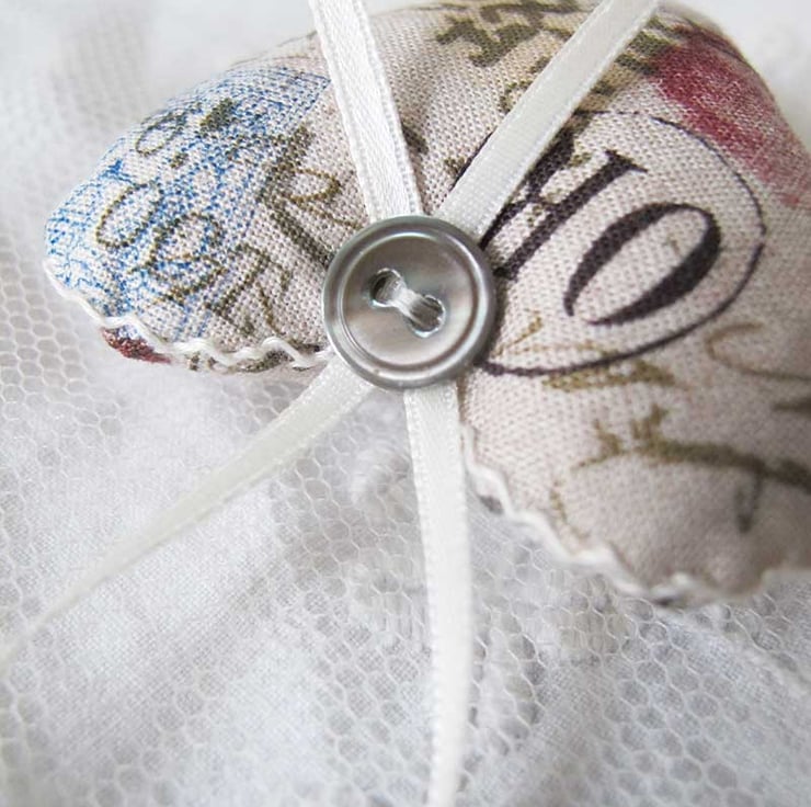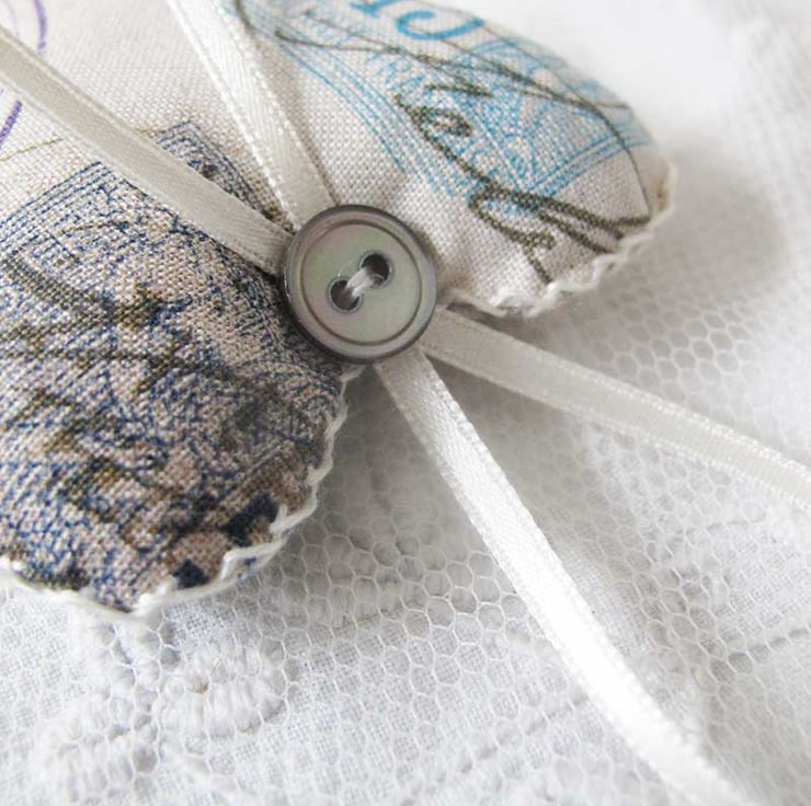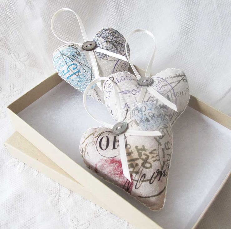 A lovely little set of three lavender bags - hand made, filled with beautiful scented lavender and then finished with hand embroidery, co-ordinating ribbon and matching grey pearly buttons. The hearts have a postal theme of stamps and postmarks, and are made in a Tim Holtz fabric in varying colours of turquoise, purple, green, black and rose pink on a warm beige background. The hearts measure approximately 6cm wide x 6.5cm long (not including the ribbon).