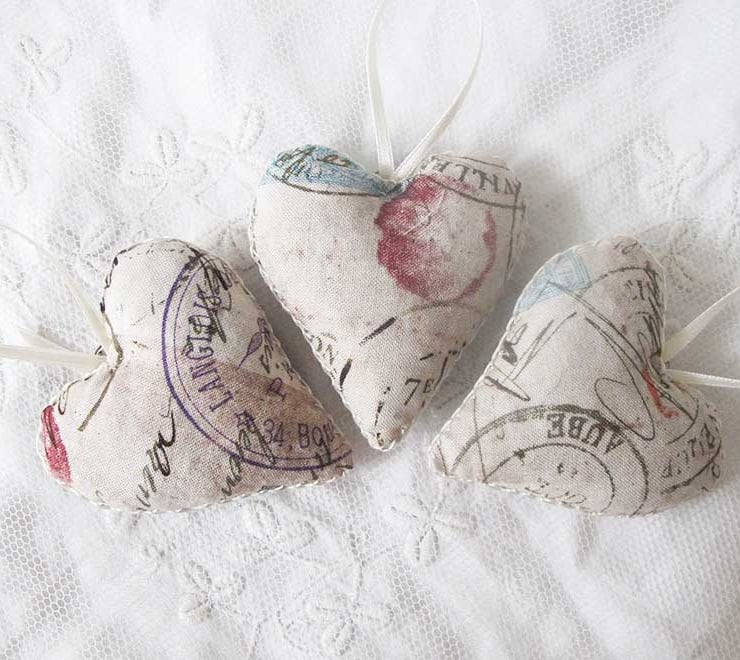SET OF 3 LAVENDER BAGS - TIM HOLTS FABRIC POSTAGE HEART SHAPED