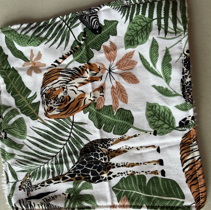 Pack of 2 wash cloths, this pack is green multi, one cloth has jungle animals on it, each cloth is 6.5 inches square and ideal for bath or basin wash time.