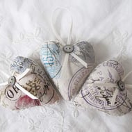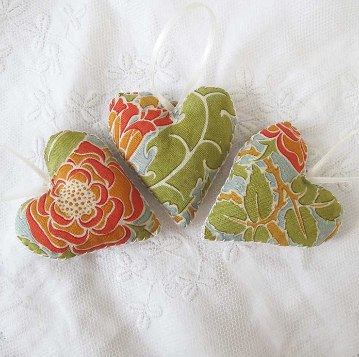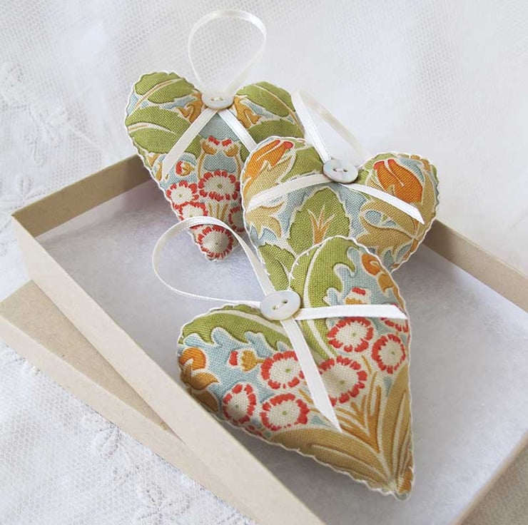 A very pretty little set of three lavender bags - hand made, filled with beautiful scented lavender and then finished with hand embroidery, satin ribbon and pearly shell buttons. The hearts measure approximately 6cm wide x 6.5cm long (not including the ribbon) and are made in a Charles Voysey design fabric. They are a lovely mix of reds, greens, yellow ochre, turquoise and cream.