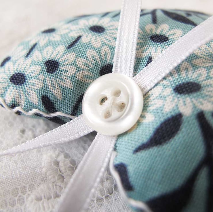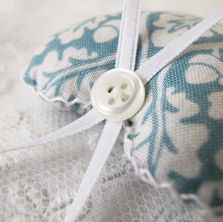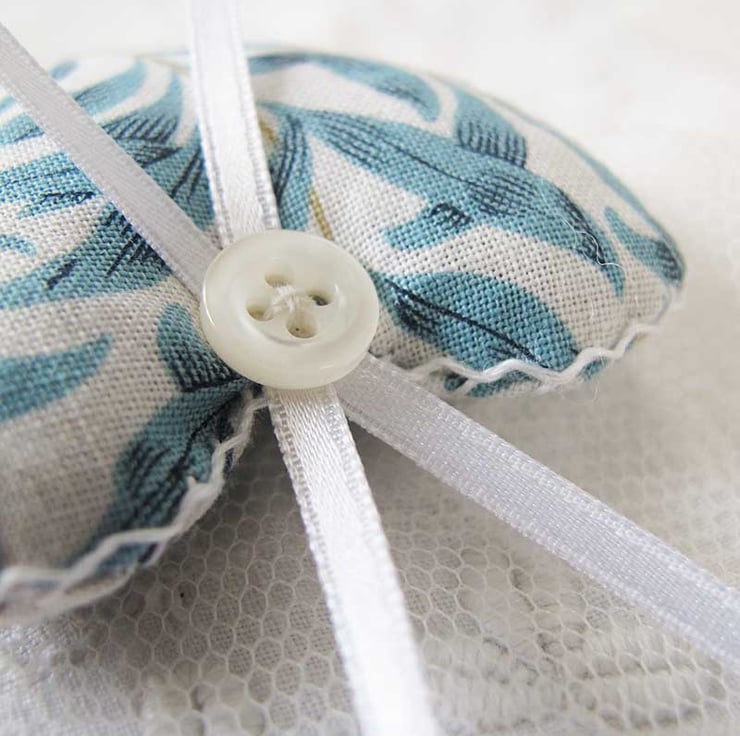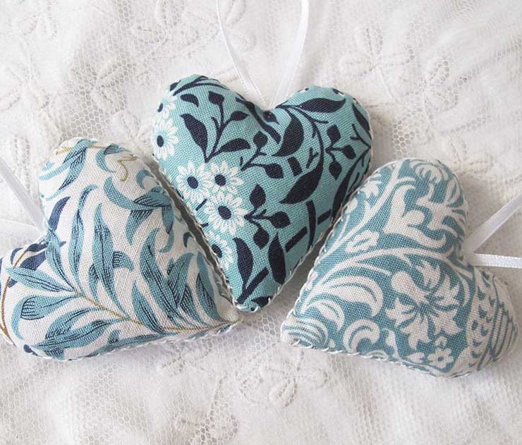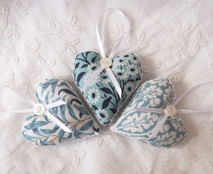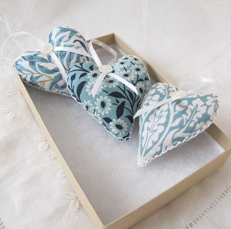 A very pretty little set of three lavender bags - hand made, filled with beautiful scented lavender and then finished with hand embroidery, co-ordinating ribbon and pearly buttons. They are made in William Morris designed fabric in shades of teal, dark blue and pale creamy white. The hearts approximately measure 6cm wide x 6.5cm long (not including the ribbon)