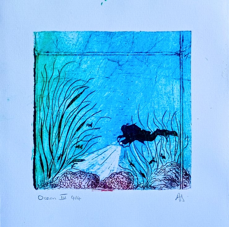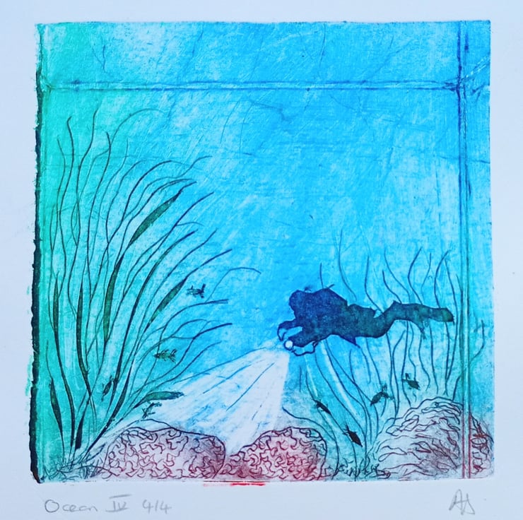This colourful drypoint featuring a scuba diver would appeal to those who love exploring the world.