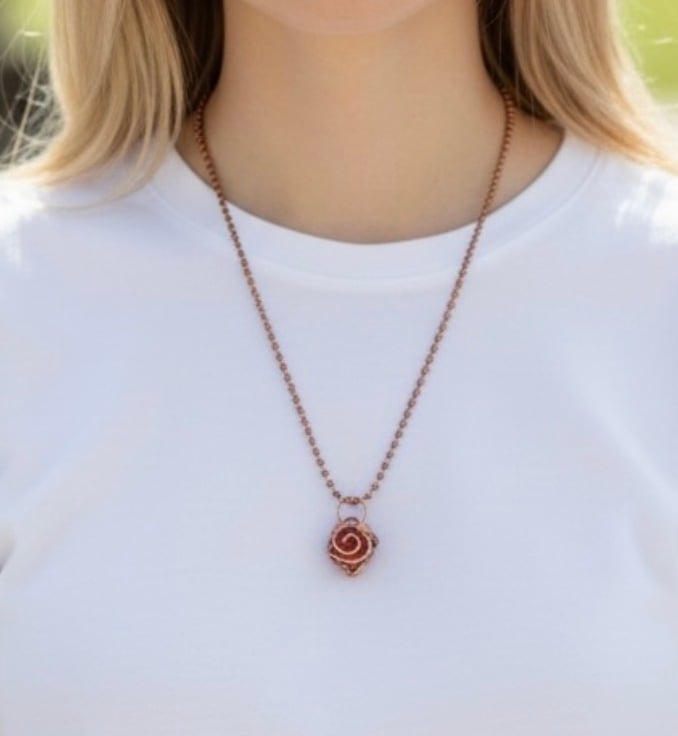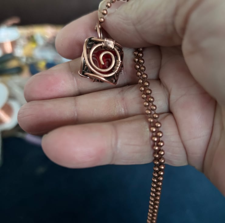 I have made this pendant using solid bare copper which I have oxidised. The pendant wire wrap design features a beautiful handmade lampwork glass heart encased in an ornate box. The pendant is attached to a copper ball chain 18”. Perfect for Valentines or Anniversary.