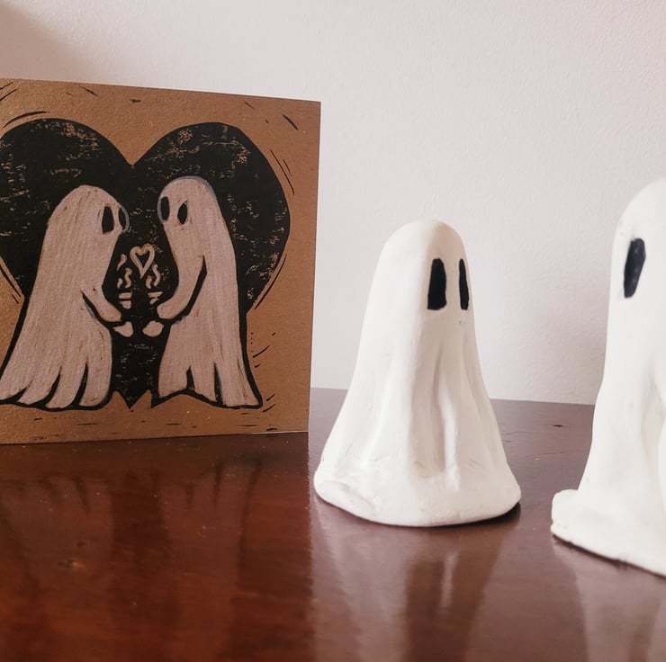 This card shows two ghosts lovingly locking eyes over their favourite caffinated beverage, with a large black heart in the background.
