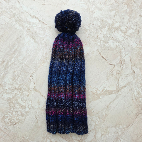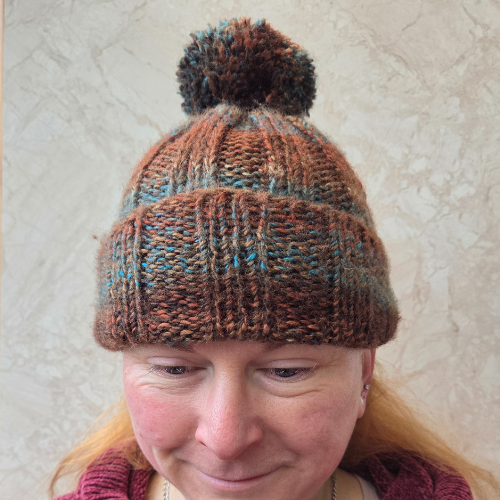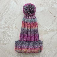 This adult bobble hat has been hand knitted by Brian. He has used chunky 100% acrylic variegated yarn to created a unique patterned hat. The hat has been knitted using a rib technique complete with handmade bobble in the same yarn.