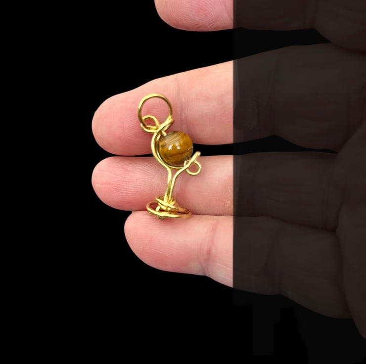 I have made this pendant using brass jewellery wire. The pendant wire wrap design features a beautiful semi Tigers Eye bead inside a globe. The pendant is attached to a 18” gold plated chain.