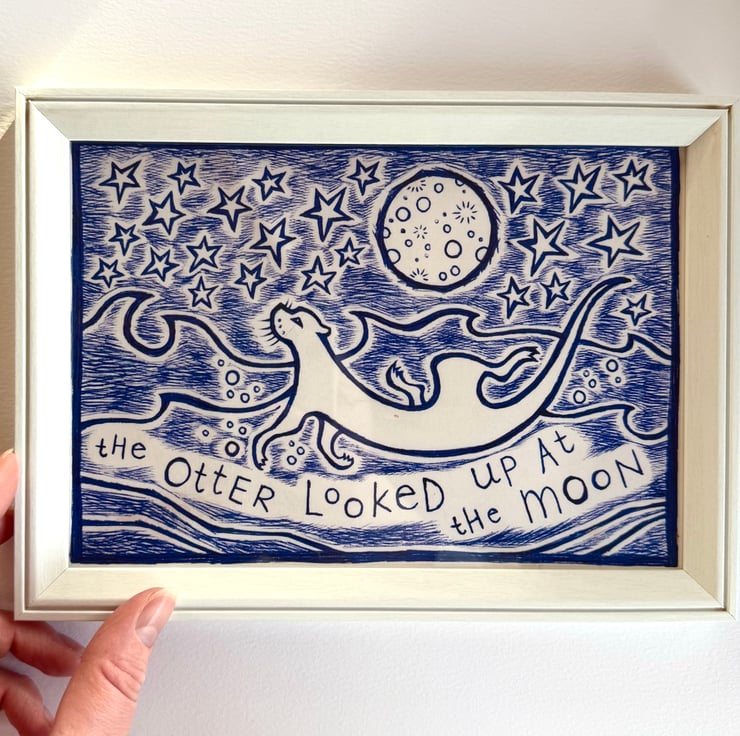 Framed A5 size giclee print produced from one of my original ink drawings animal art illustration designs. Lettering reads "The Otter Looked Up At the Moon".
