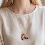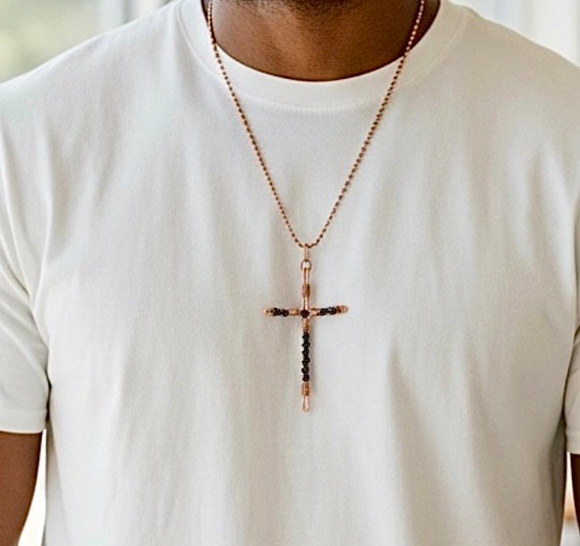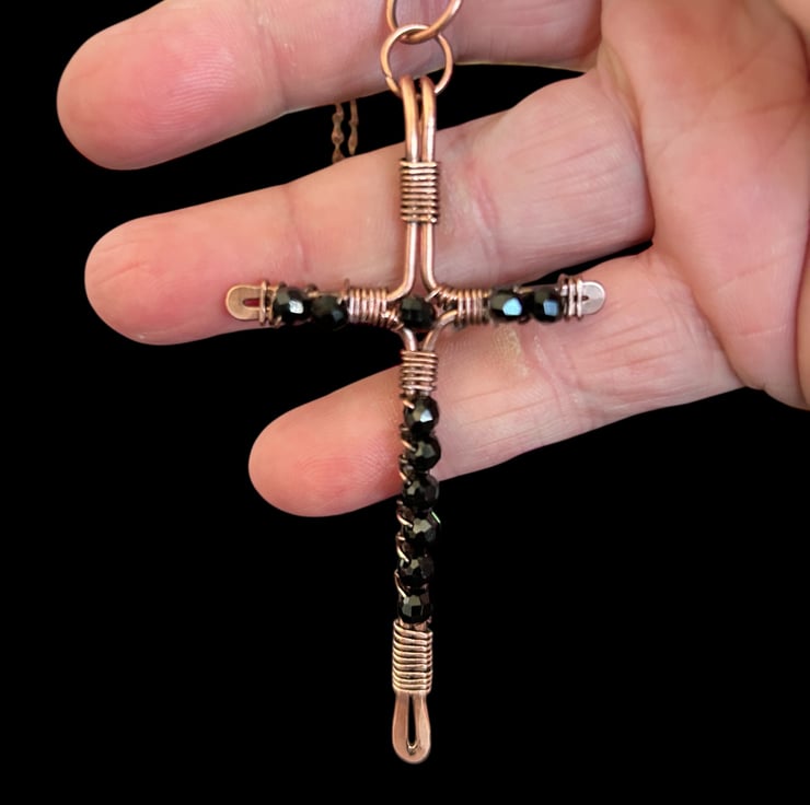 This Oxidised Copper Cross Pendant is a handcrafted piece that would make a unique addition to any jewellery collection. The pendant features natural black crystals set in pure 99.9% Copper, patinated with Liver of Sulphur for a polished oxidised finish. The cross shape and wire wrapping setting style give it a vintage look, perfect for those who appreciate alchemy jewellery.