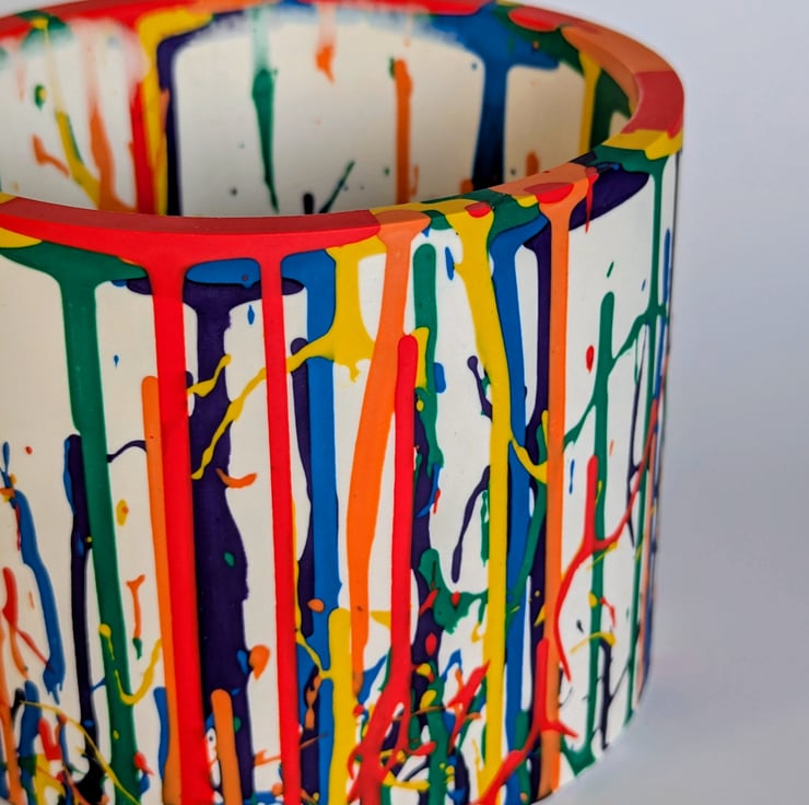 Make a bold statement with this eye-catching handmade jesmonite plant pot, featuring a vibrant rainbow splatter design over a soft off-white base. Each pot is individually finished with dynamic paint-drip detailing, meaning no two are ever the same.
