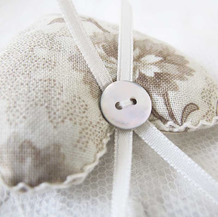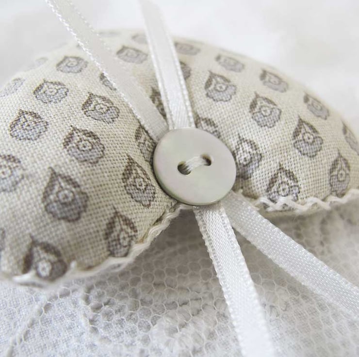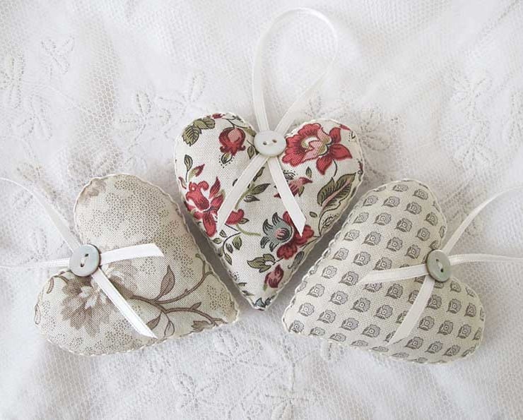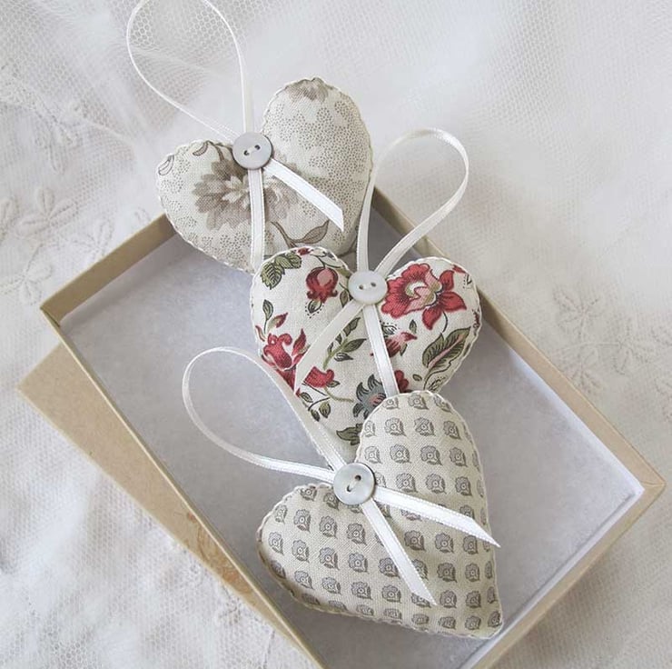 A very pretty little set of three lavender bags - hand made, filled with beautiful scented lavender and then finished with hand embroidery, satin ribbon and gorgeous little pearly buttons. They are in co-ordinating fabrics of cream, taupe, dark pink/red and green. The hearts measure approximately 6cm wide x 6.5cm long, not including the ribbon.