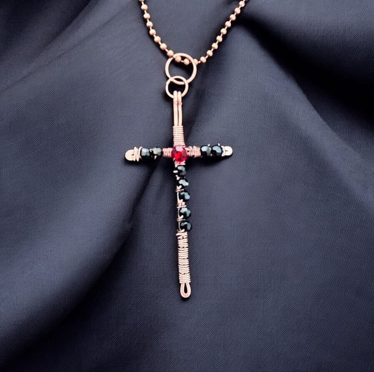 Oxidised Copper Black and Dark Red Crystals Cross - Goth, Alchemy