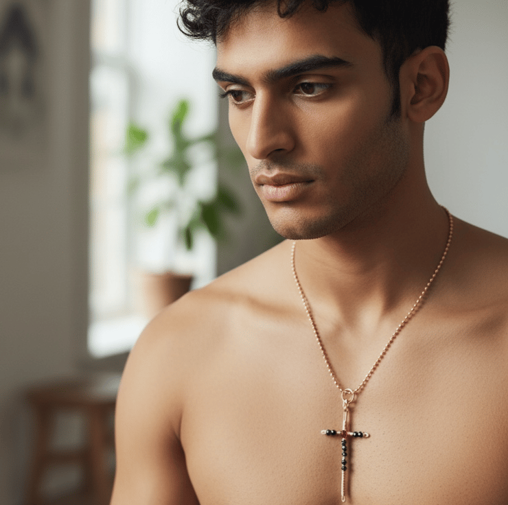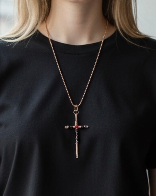 This Oxidised Copper Cross Pendant is a handcrafted piece that would make a unique addition to any jewellery collection. The pendant features natural black crystals set in pure 99.9% Copper, patinated with Liver of Sulphur for a polished oxidised finish. The cross shape and wire wrapping setting style give it a vintage look, perfect for those who appreciate alchemy jewellery.