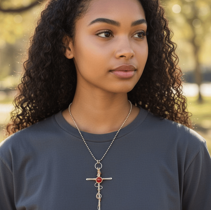 This Copper Cross Pendant is a handcrafted piece that would make a unique addition to any jewellery collection. The pendant features natural semi precious Carnelian Bead set in pure 99.9% Copper, with a polished finish. The cross shape and wire wrapping setting style give it a vintage look, perfect for those who appreciate alchemy jewellery.