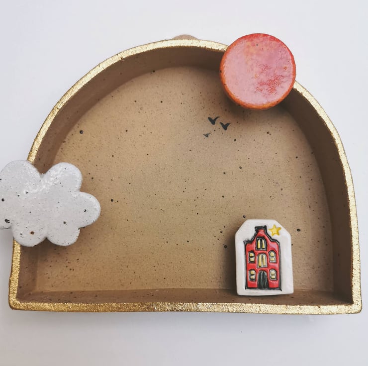 Formed from speckled lavafleck stoneware clay and fired to 1160 degrees, this shrine is designed to hold tiny treasures or small images to create a changeable stage for a tableau of your making. Glazed with an orange and pink sponged sun, white cloud and gilded with gold coloured metal leaf.