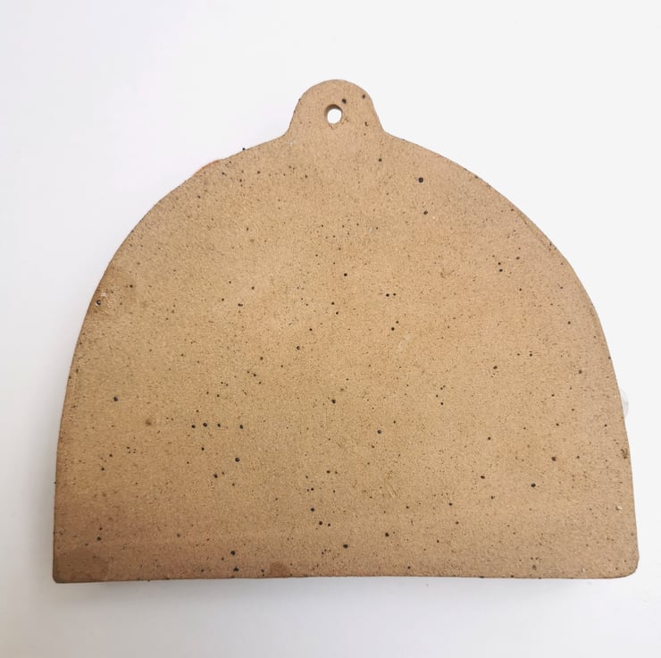 This stoneware ceramic wall shrine is slightly flawed due to a bit of warping of the cloud on the left of the shrine. It has tipped down into the shrine a little during firing, not sitting entirely flat on the border of the shrine frame as intended. There is also a little warping of the bottom part of the shrine frame too. This doesn't prevent little treasures from being placed in the shrine but just detracts a bit,visually.