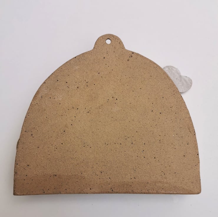 This stoneware ceramic wall shrine is slightly flawed due to a bit of warping of the cloud on the left of the shrine. It has curved around the frame of the shrine a little during firing, not sitting entirely flat on the border of the shrine frame as intended. There is also a little warping of the bottom part of the shrine frame too. This doesn't prevent little treasures from being placed in the shrine but just detracts a bit,visually.