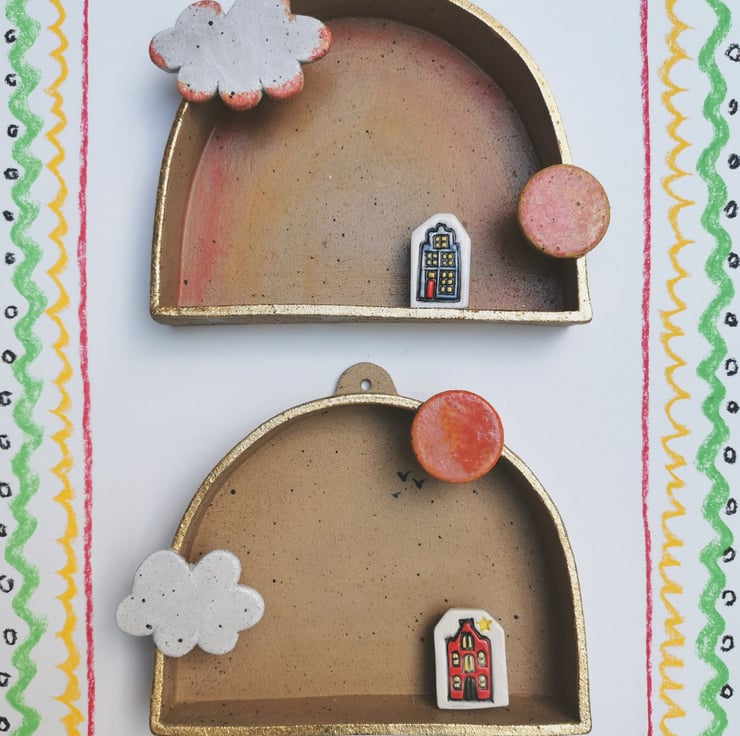 Formed from speckled lavafleck stoneware clay and fired to 1160 degrees, this shrine is designed to hold tiny treasures or small images to create a changeable stage for a tableau of your making. Glazed with an orange and pink sponged sun, white cloud and gilded with gold coloured metal leaf. There is a subtle wash of red and orange glaze on the background of the piece to suggest a radiant sunset.