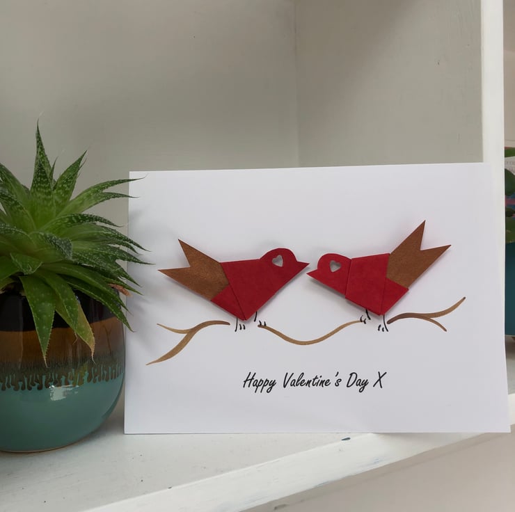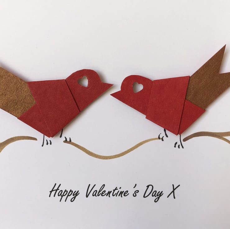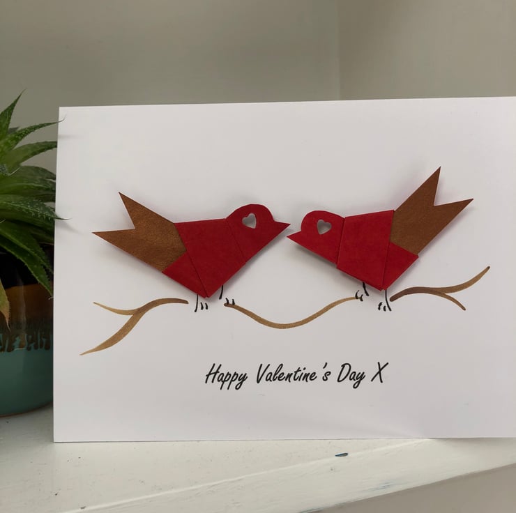 Handcrafted Valentine's card featuring two paper lovebirds, handfolded and perched on a handpainted branch. The lovebirds are made from a textured paper in red and rust.