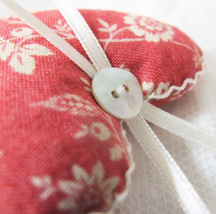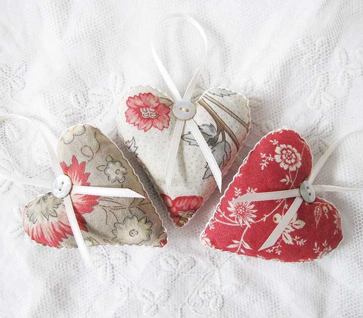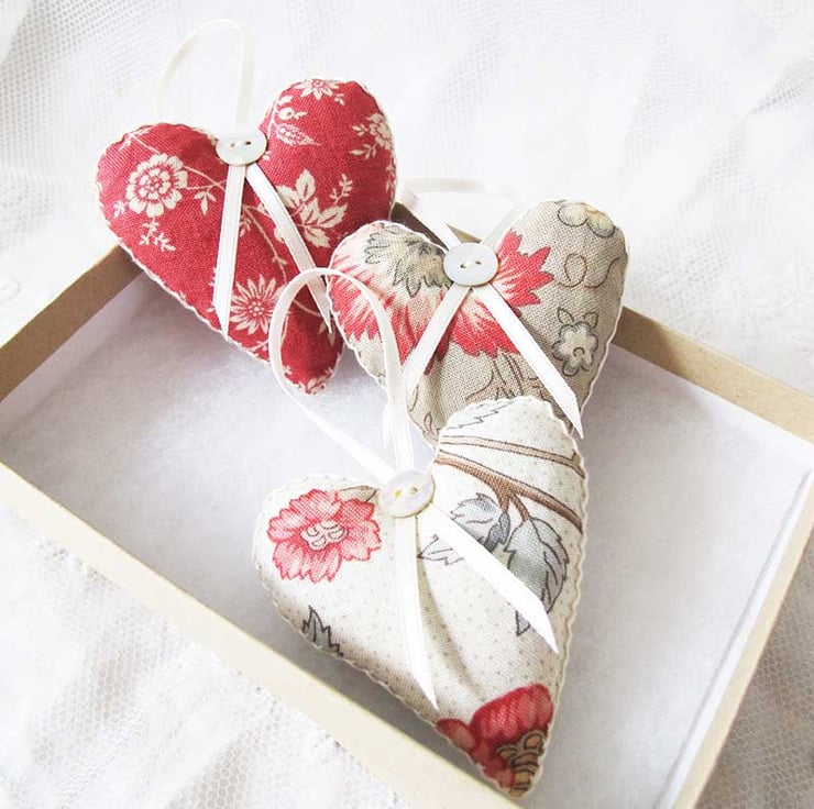 A very pretty little set of three lavender bags - hand made, filled with beautiful scented lavender and then finished with hand embroidery, satin ribbon and pearly buttons. They are made in co-ordinating fabrics in shades of taupe, red, cream and a touch of pale blue. The hearts approximately measure 6cm wide x 6.5cm long (not including the ribbon)