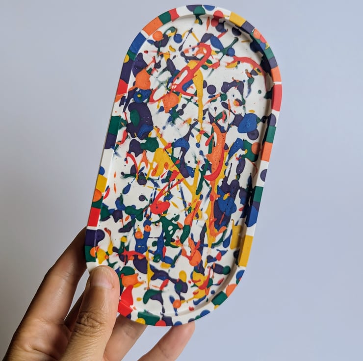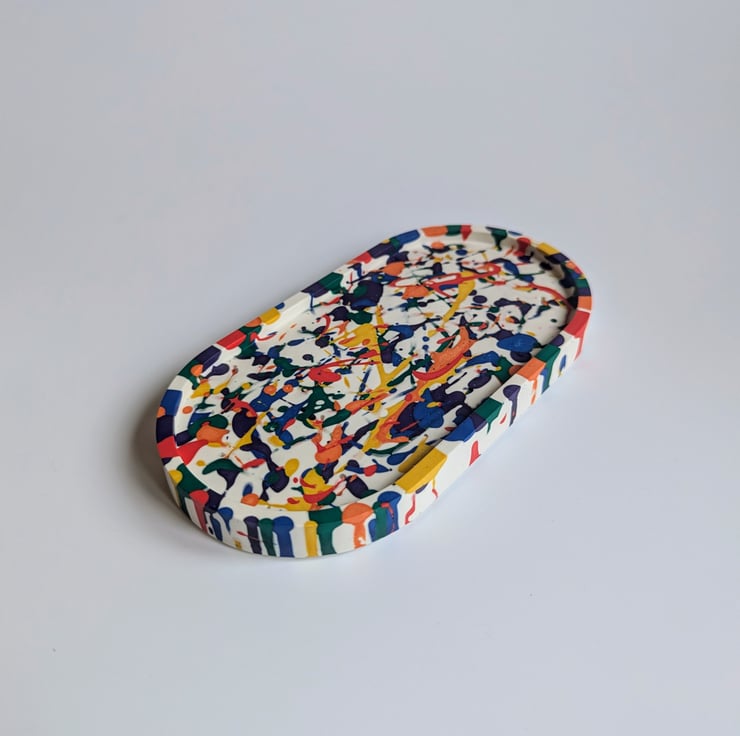 Add a joyful pop of colour to your home with this handmade oval trinket tray, finished with a bold rainbow splatter design that’s playful, vibrant, and full of personality.
