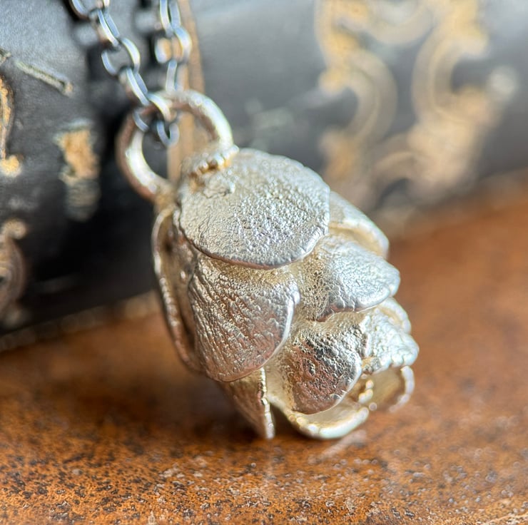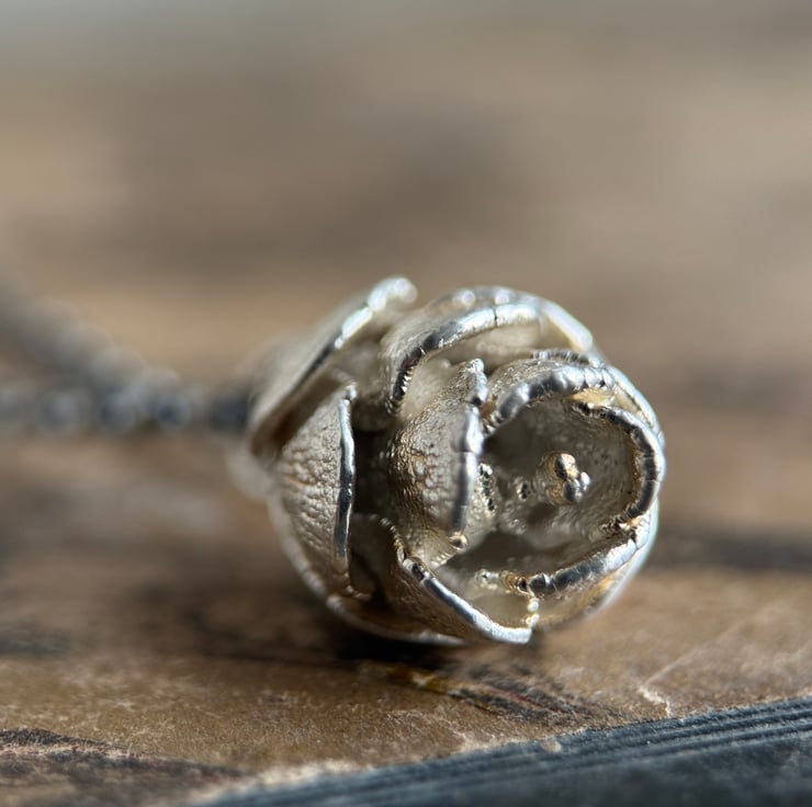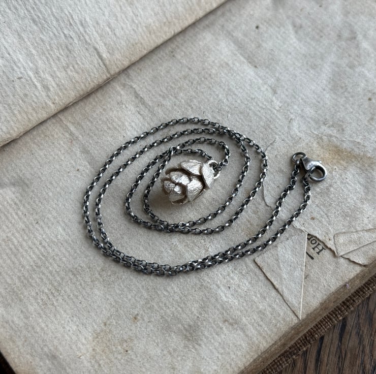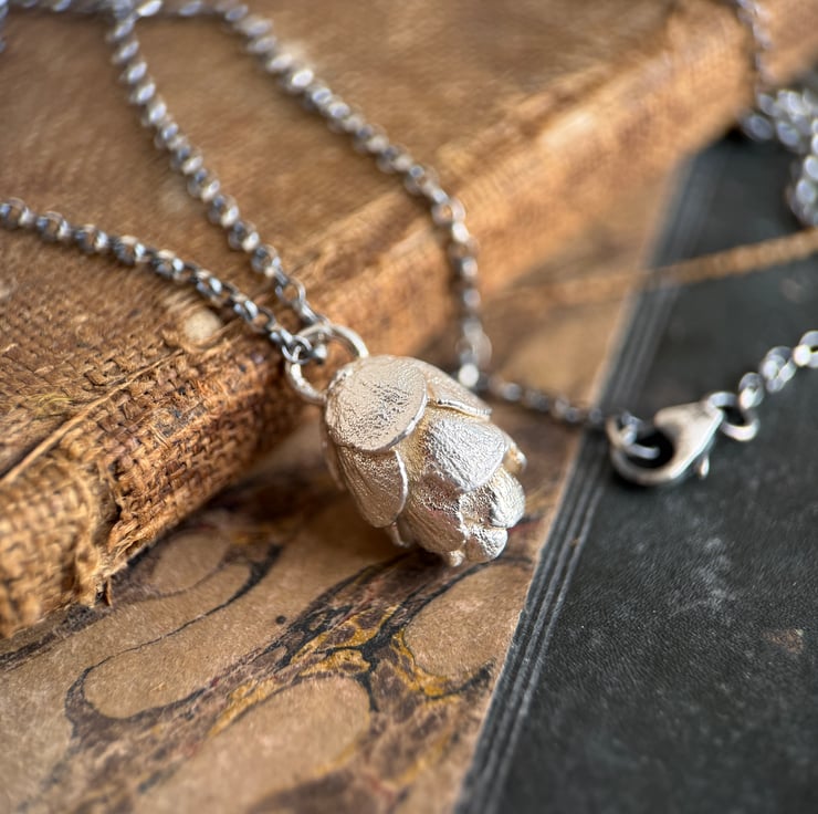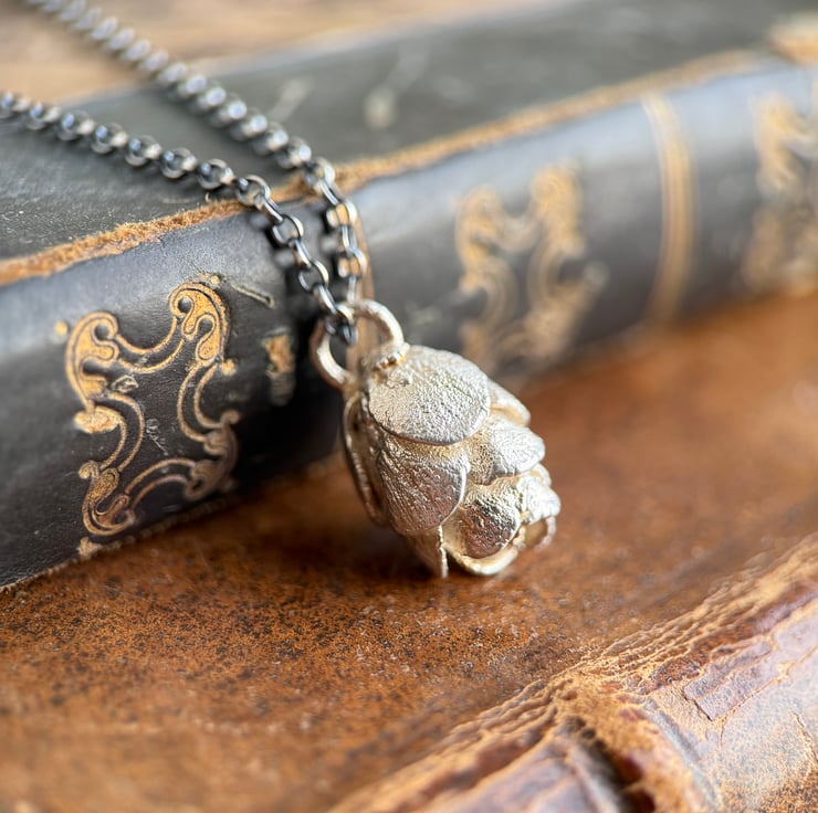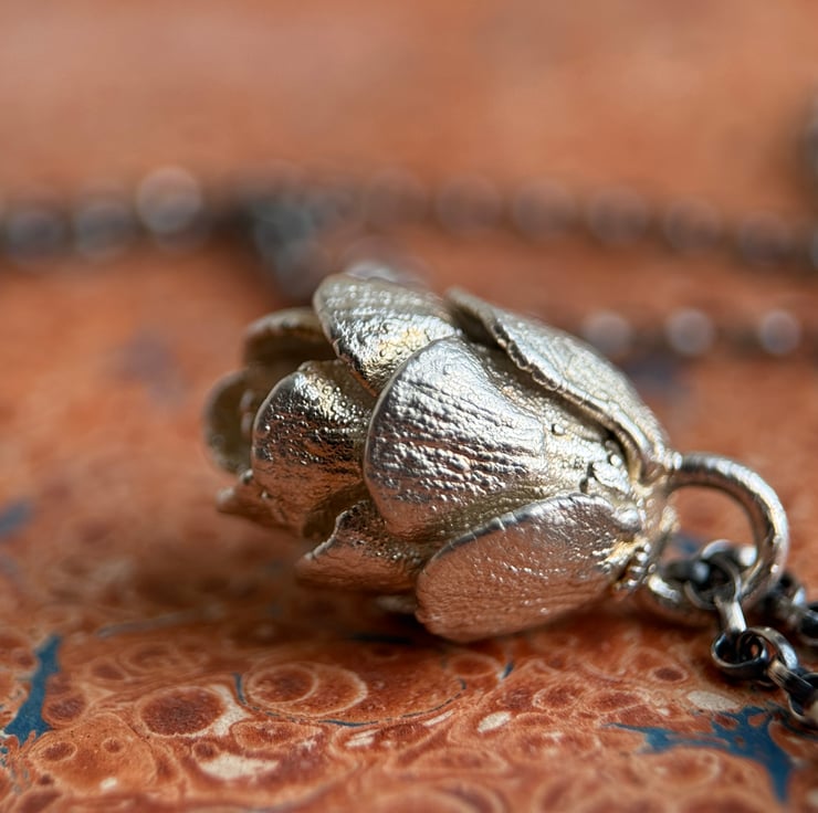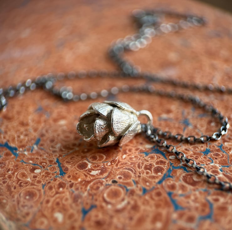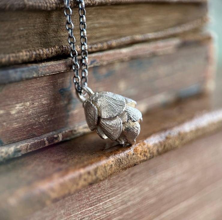 A one of a kind silver encased Hemlock cone necklace, made with a real hemlock cone coated and preserved within a thick layer of high purity silver. The cone was collected from a Hemlock tree in northern England.