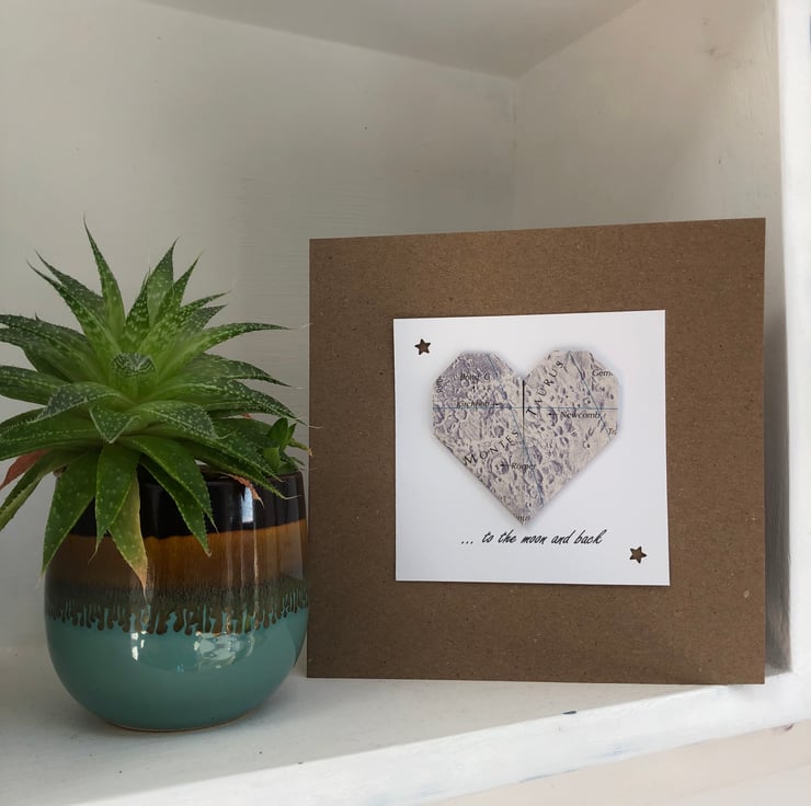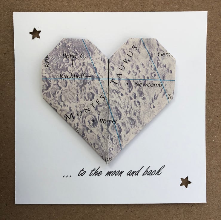 A unique Valentine's card repurposed from a map of the moon which has been folded by hand into an Origami loveheart. Each loveheart displays a detailed area of the near side of the moon and it's physical features (image is selected at random). The loveheart is mounted on white card with the wording ...'to the moon and back', and is then set onto a brown paper greetings card.
