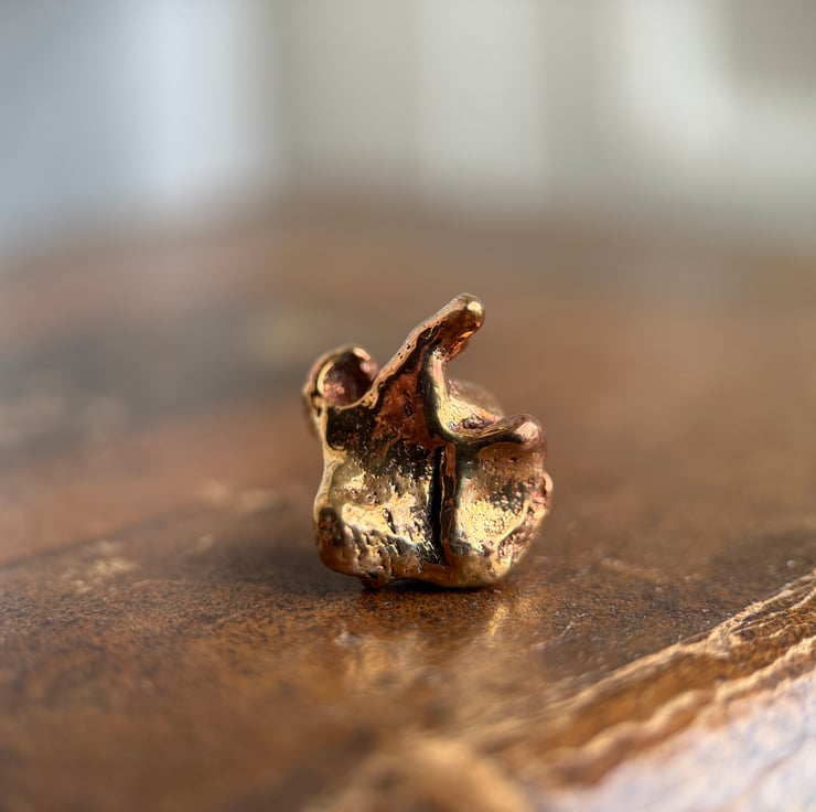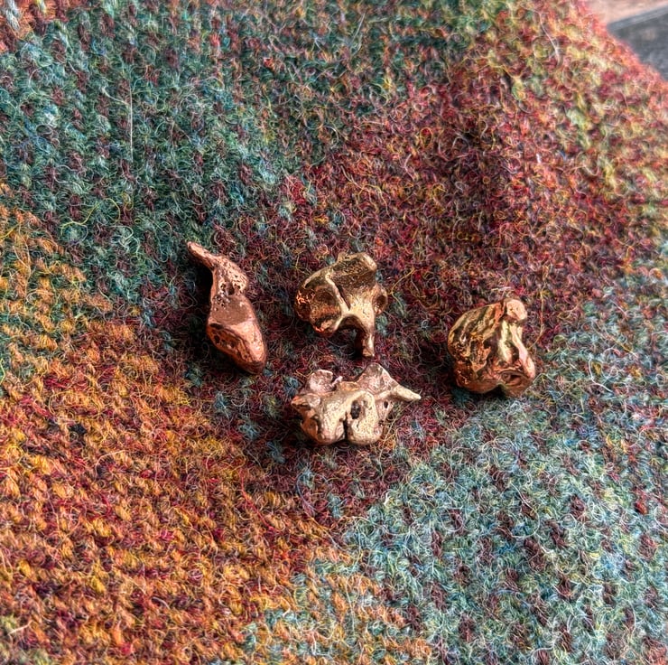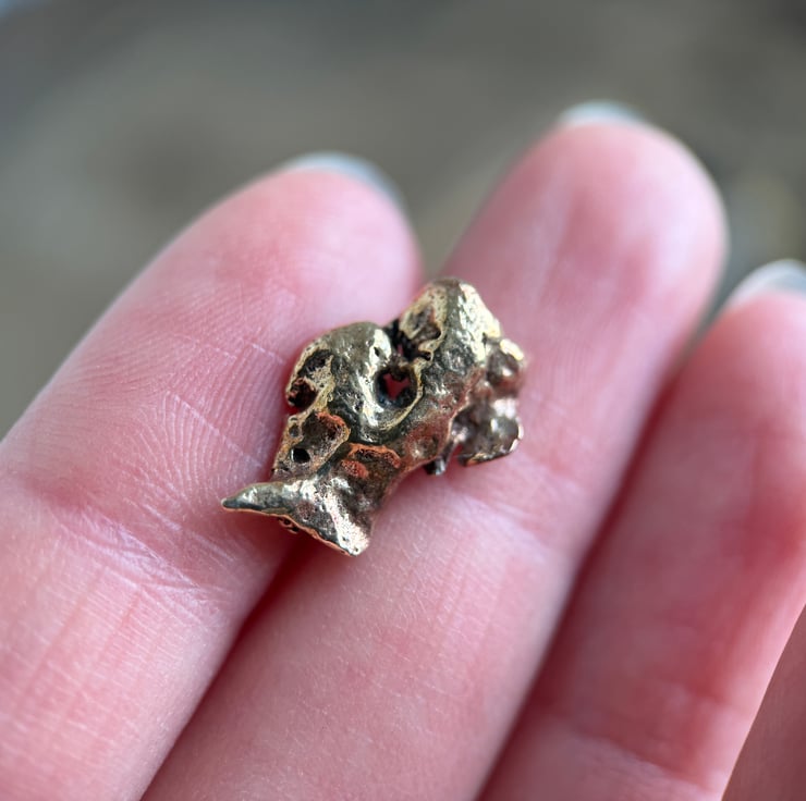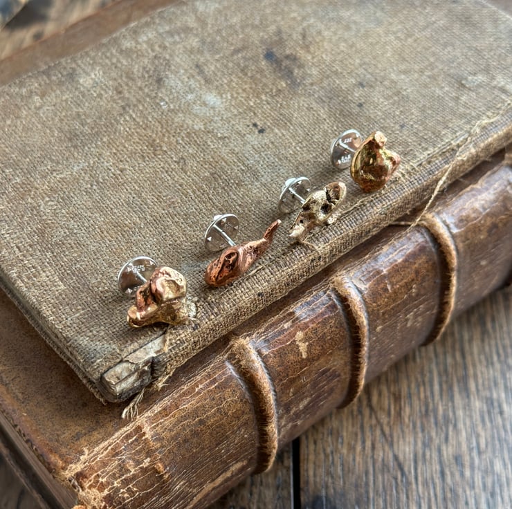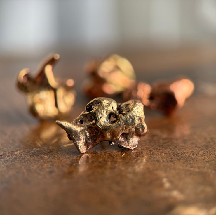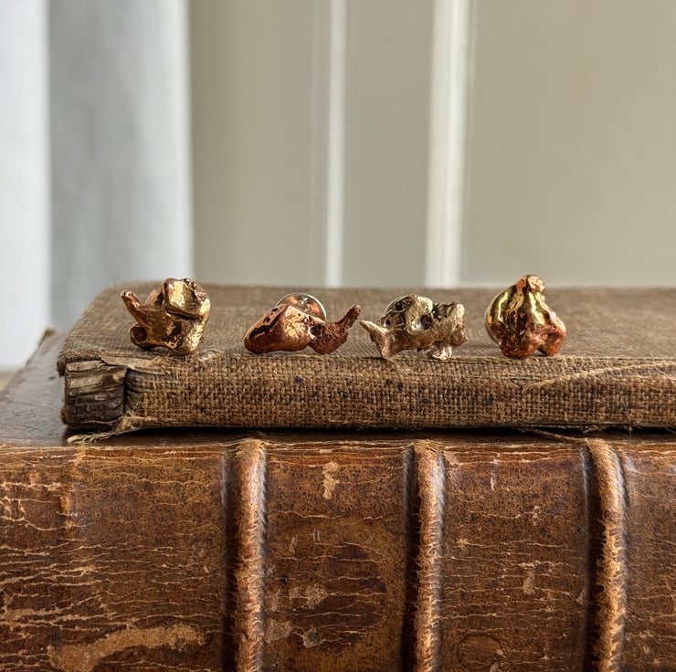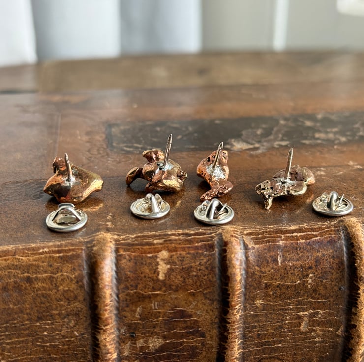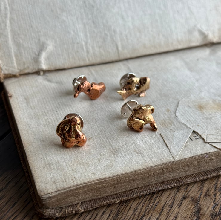 Unique copper alloy nugget pin badges made from small nuggets we found on a historic ship building site.