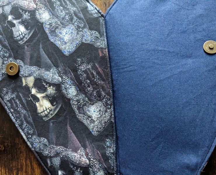 Macabre Occult Print: The high-quality fabric features a detailed dark print of skulls draped in silver-toned lace and fabric, set against a deep black background.
