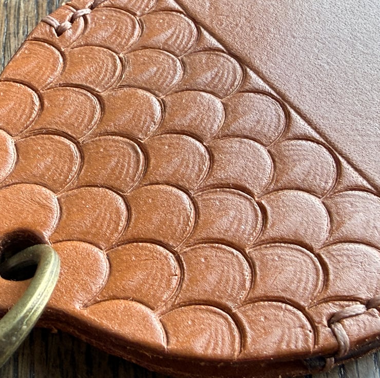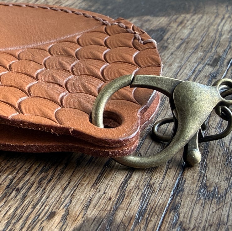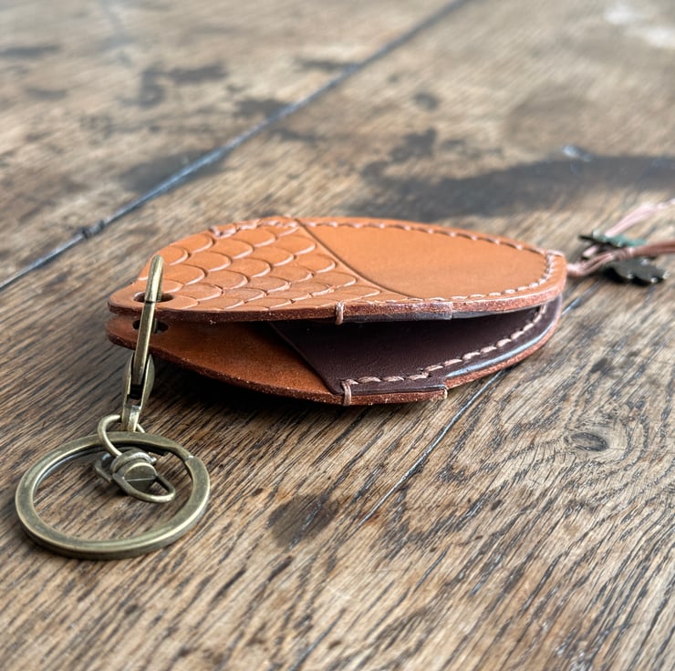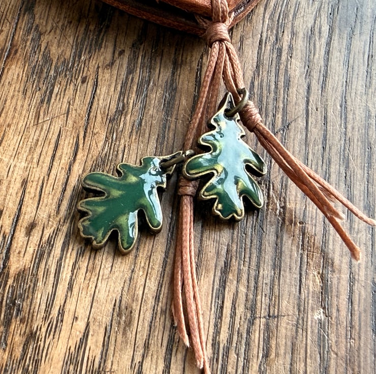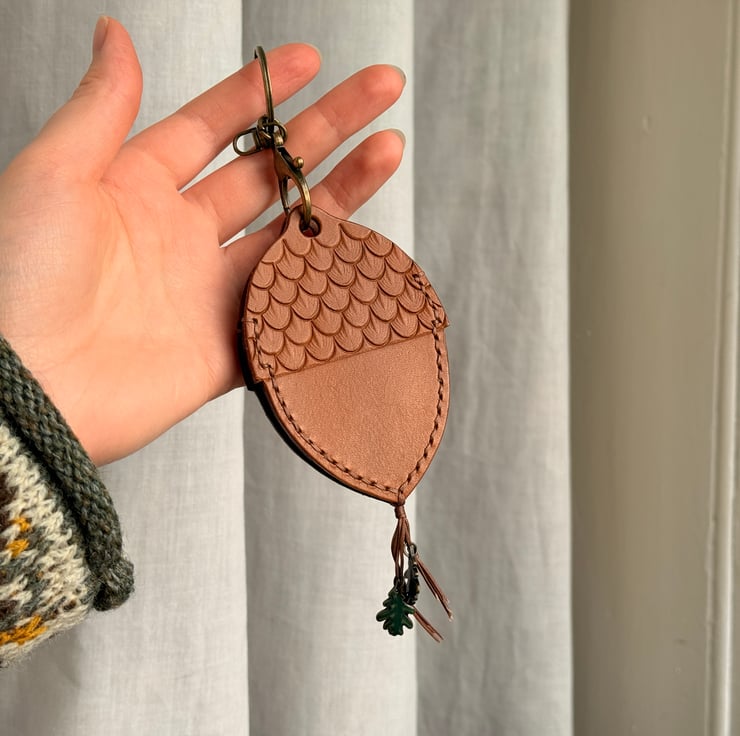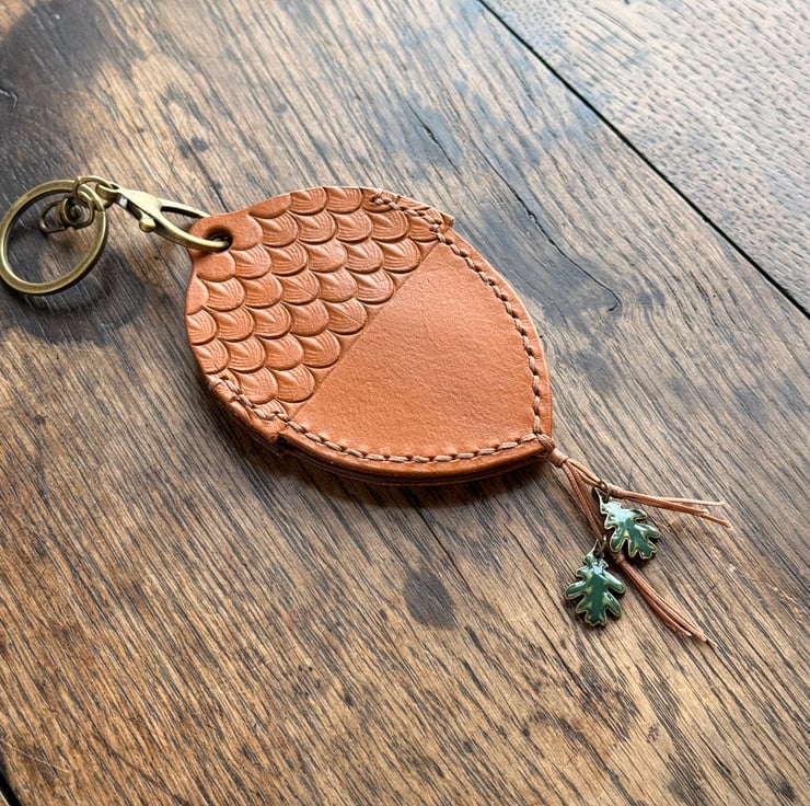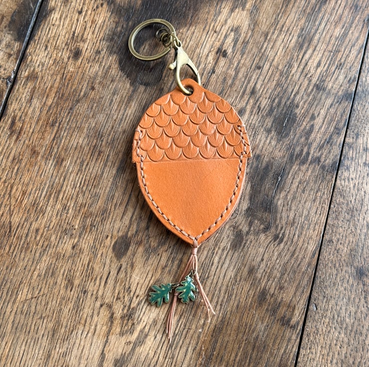 This leather acorn keyring/bag charm was designed and handmade by Gail. Crafted from high quality veg tan leather, waxed cord and enamel metal oak leaves beads.