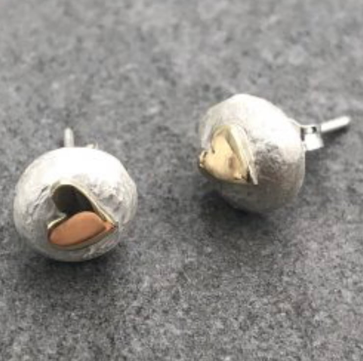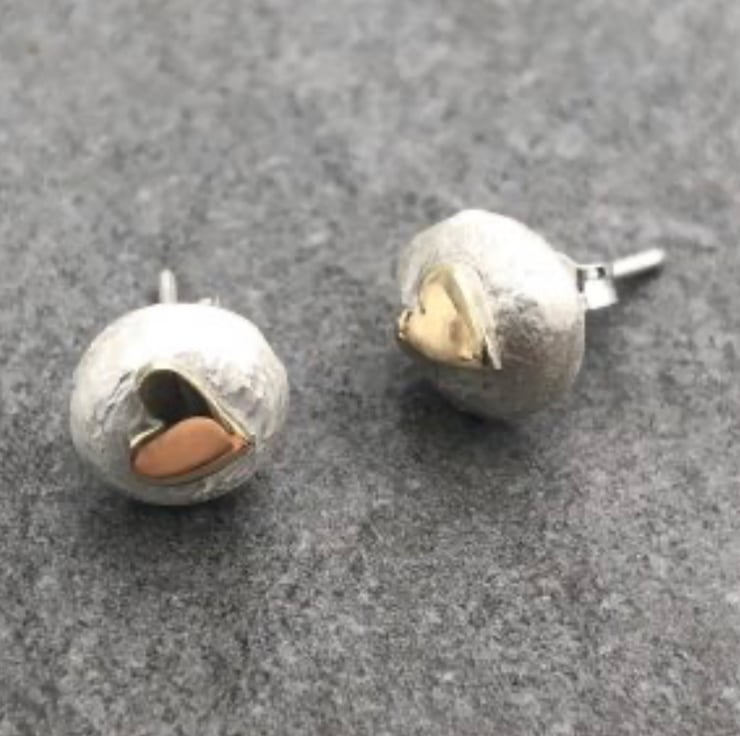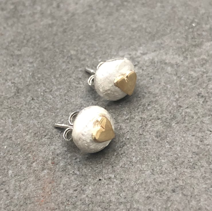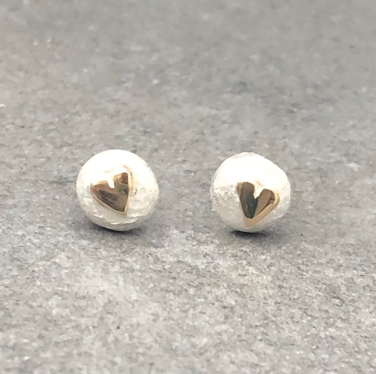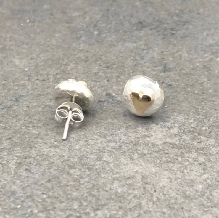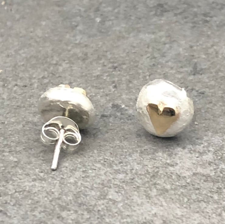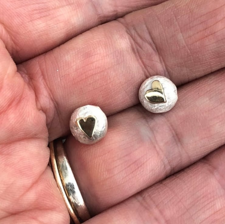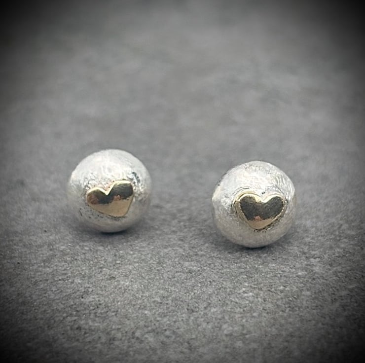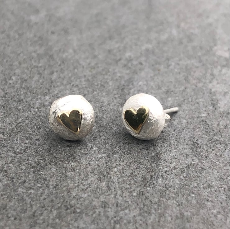 These Gold Heart Pebble Studs have been handcrafted by Michelle using solid Sterling Silver and 9ct yellow gold. They measure approximately: 9mm in diameter and have Sterling Silver posts and butterfly backs. The silver has a satin finish which contrasts beautifully with the solid and shiny 9ct gold hearts.