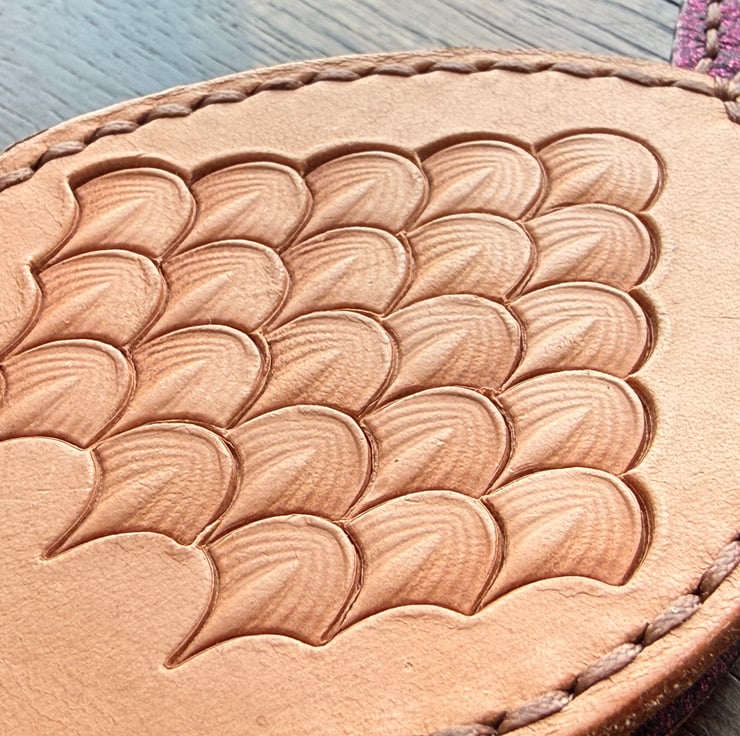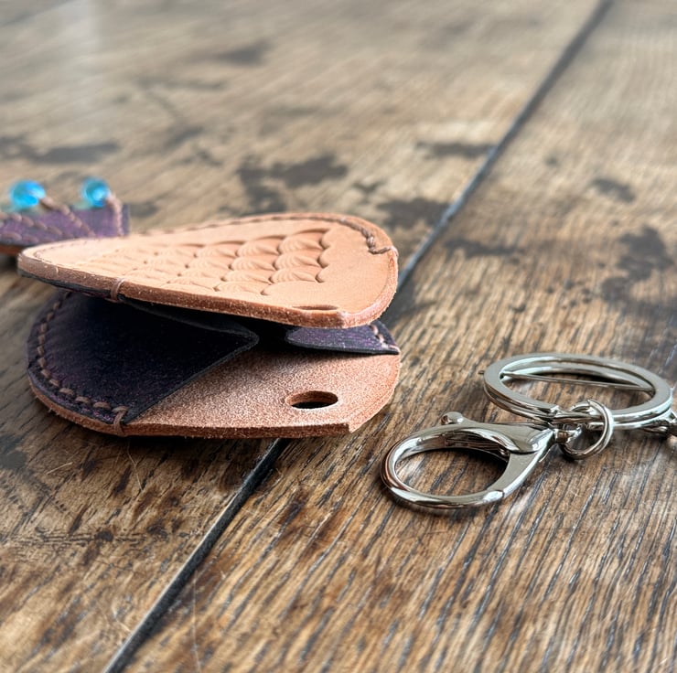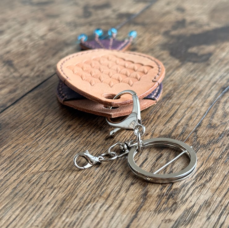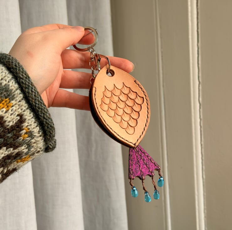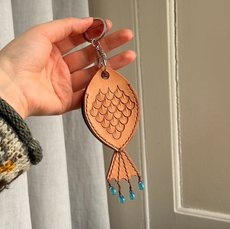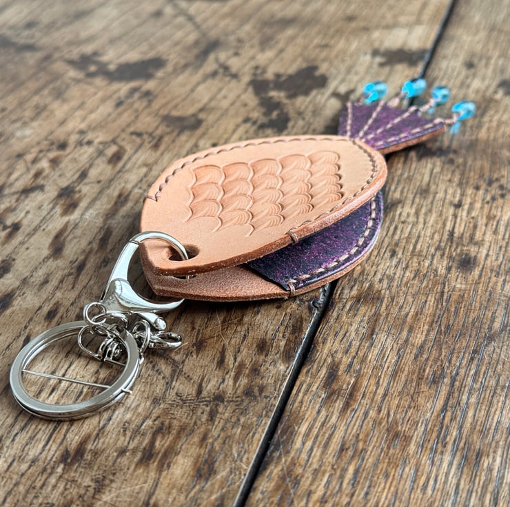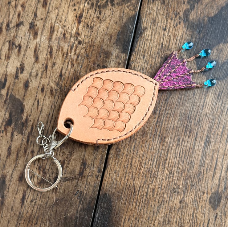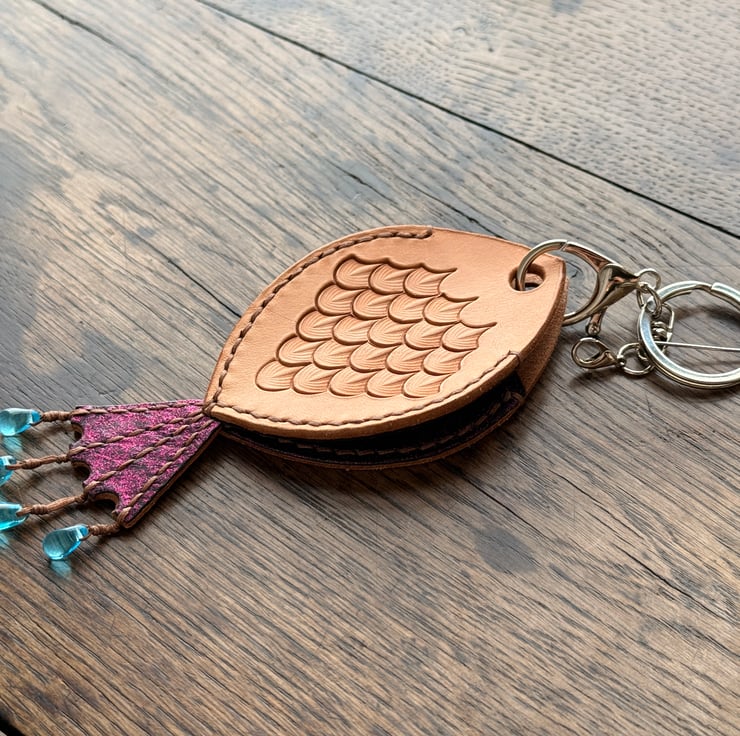 This leather fish keyring/bag charm was designed and handmade by Gail. Crafted from high quality veg tan leather, waxed cord and glass beads.