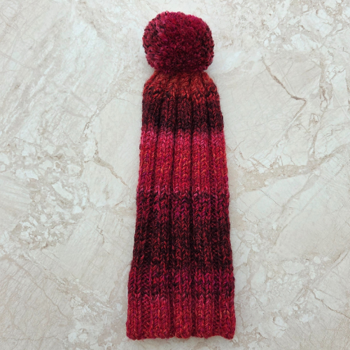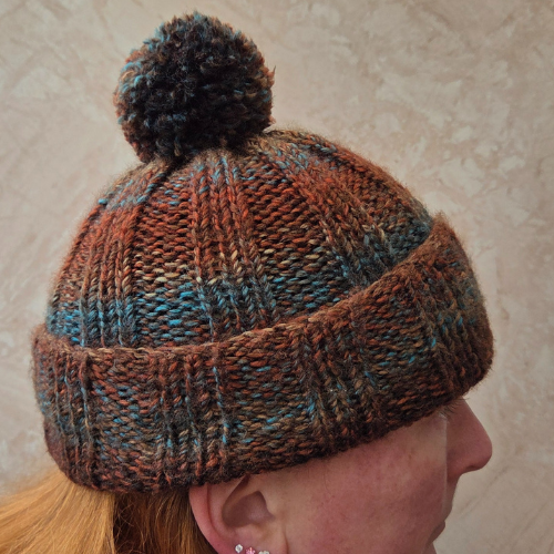 This adult bobble hat has been hand knitted by Brian. He has used chunky 100% acrylic variegated yarn to created a unique patterned hat. The hat has been knitted using a rib technique complete with handmade bobble in the same yarn.