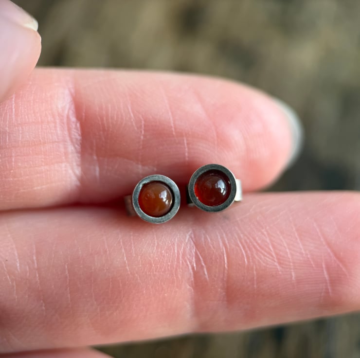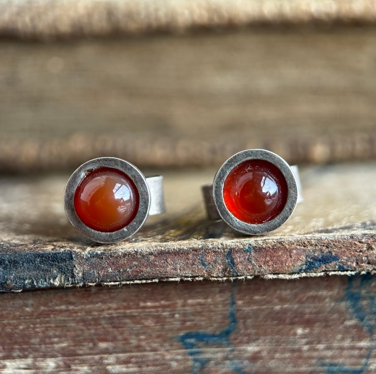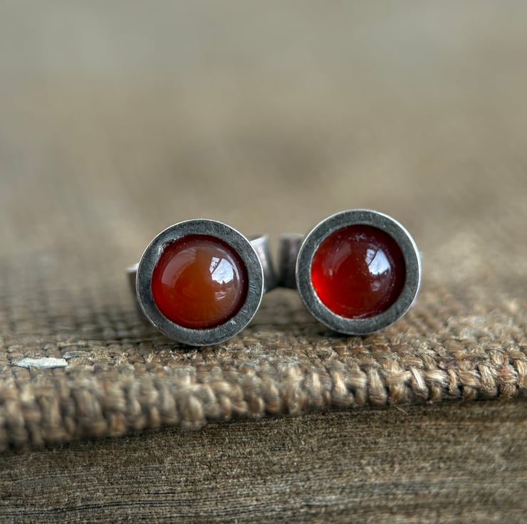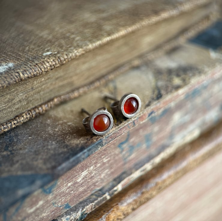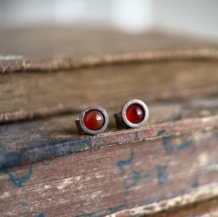 A unique pair of recycled sterling silver stud earrings with 4mm carnelian cabochons.