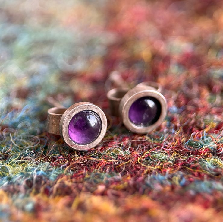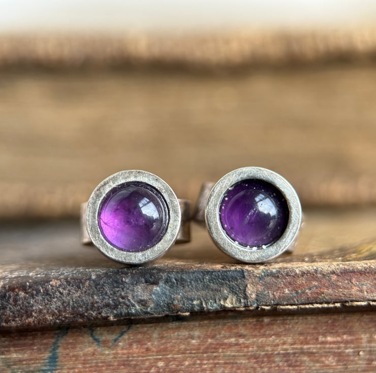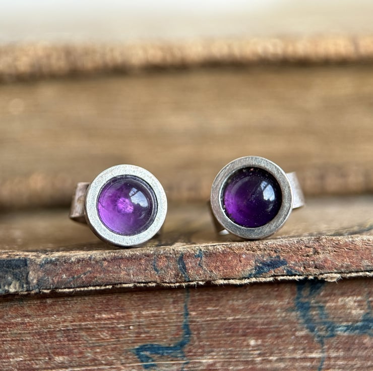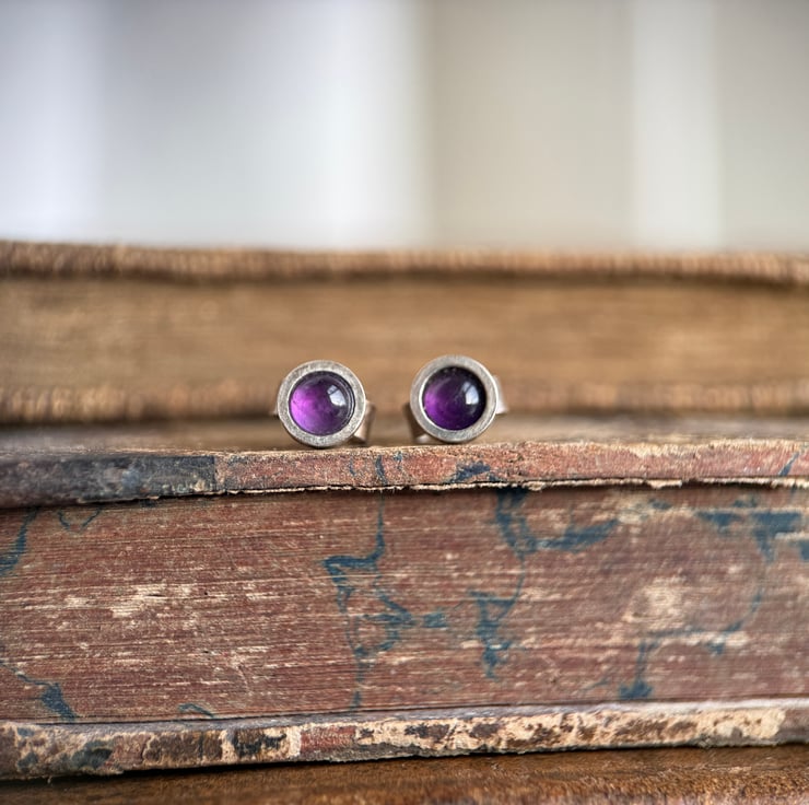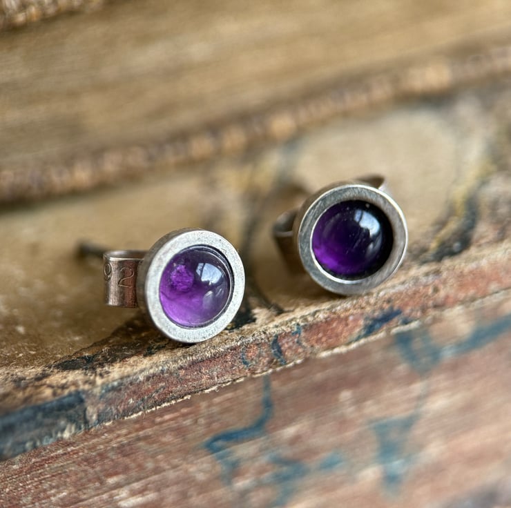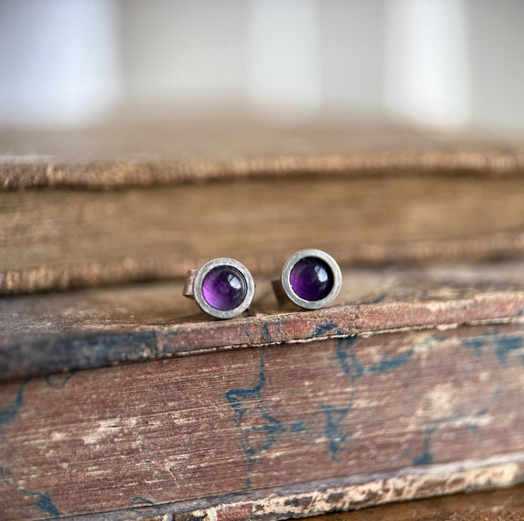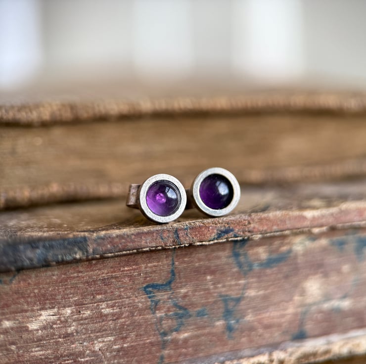 A unique pair of recycled sterling silver stud earrings with 4mm amethyst cabochons.