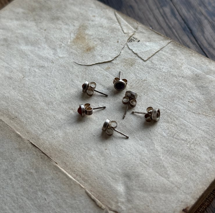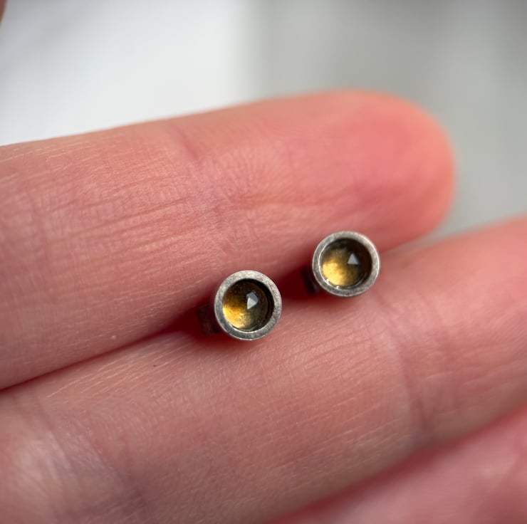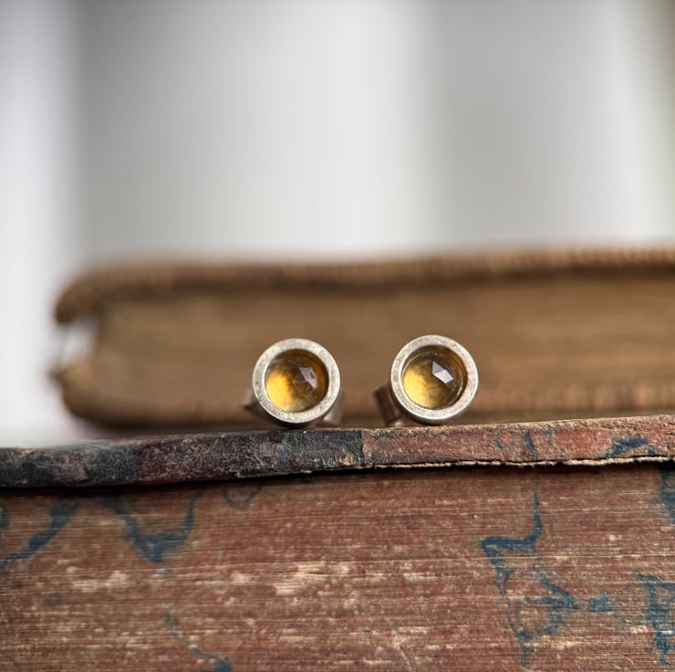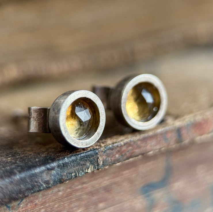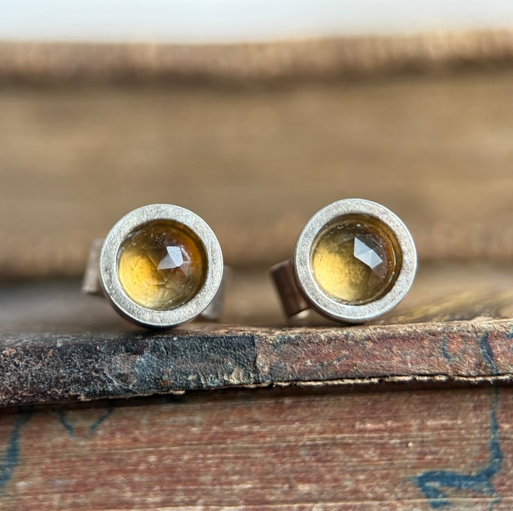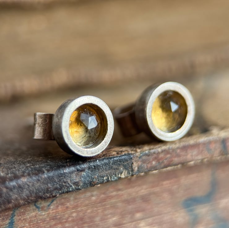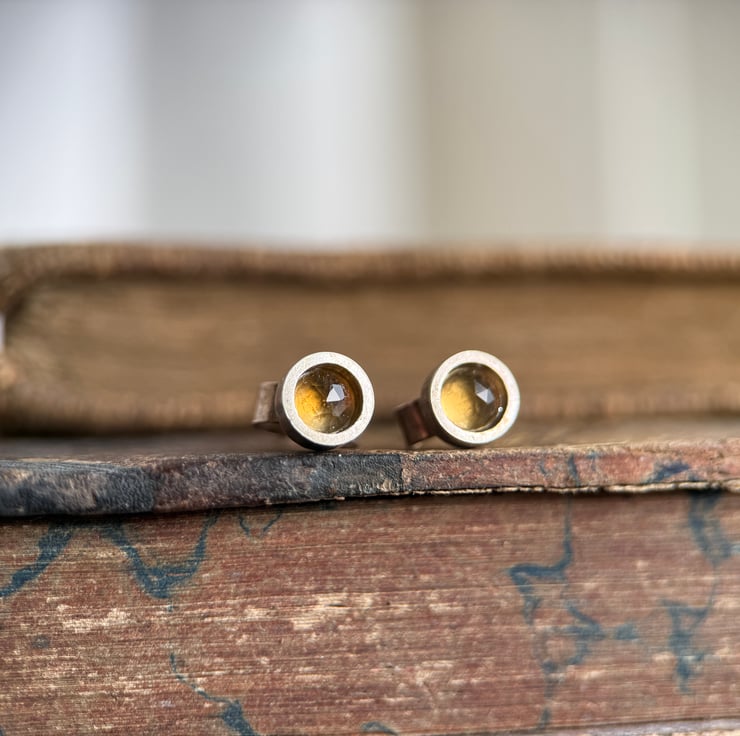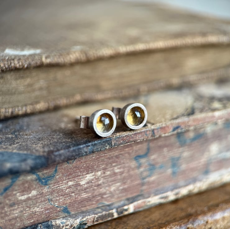 A unique pair of recycled sterling silver stud earrings with 4mm citrine cabochons.