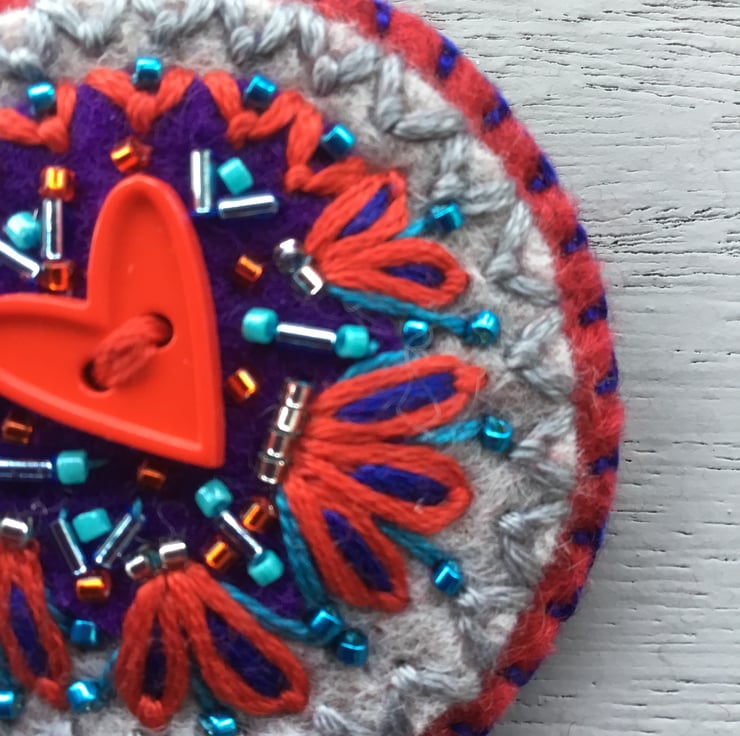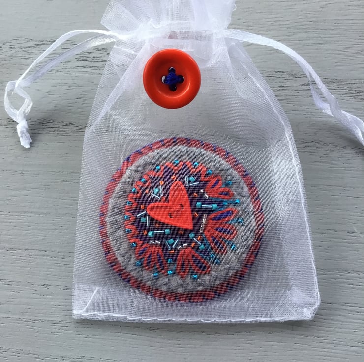 This Hand Embroidered Heart Button Brooch has a red Heart Button in the centre of an embroidered abstract design. This Heart Button is sewn onto circles of blue, grey and red wool felt, hand embroidered Fly and Lazy Daisy Stitches with silver, blue and red beads, radiate and surround this red Heart button.
