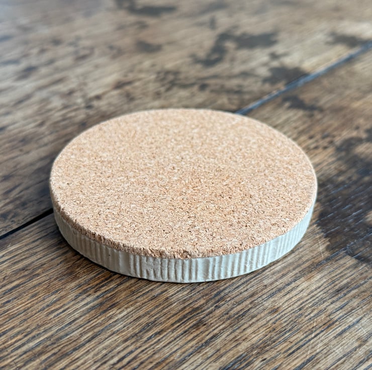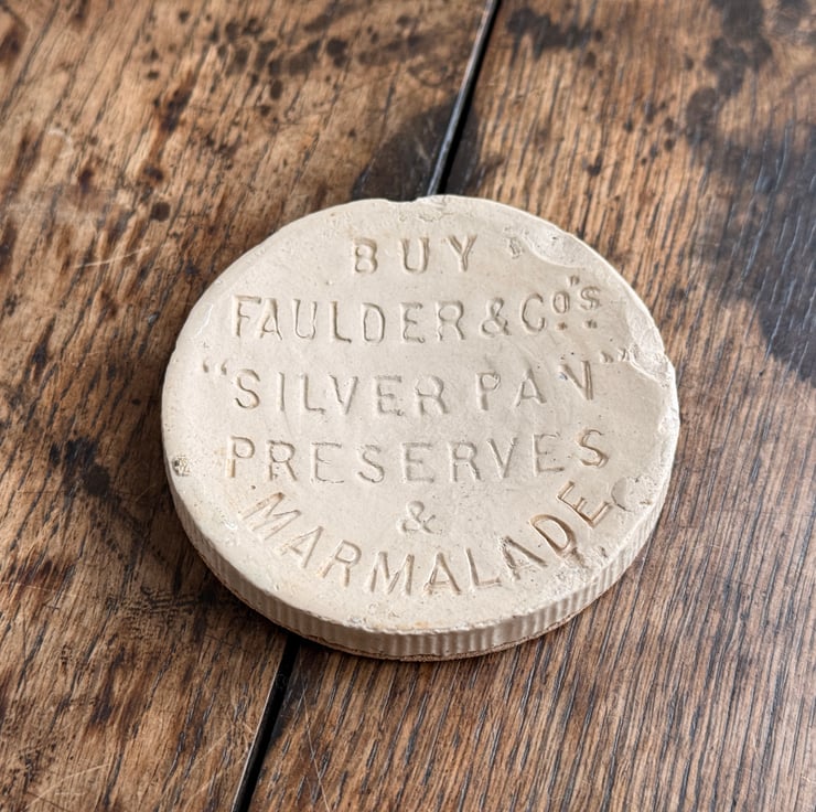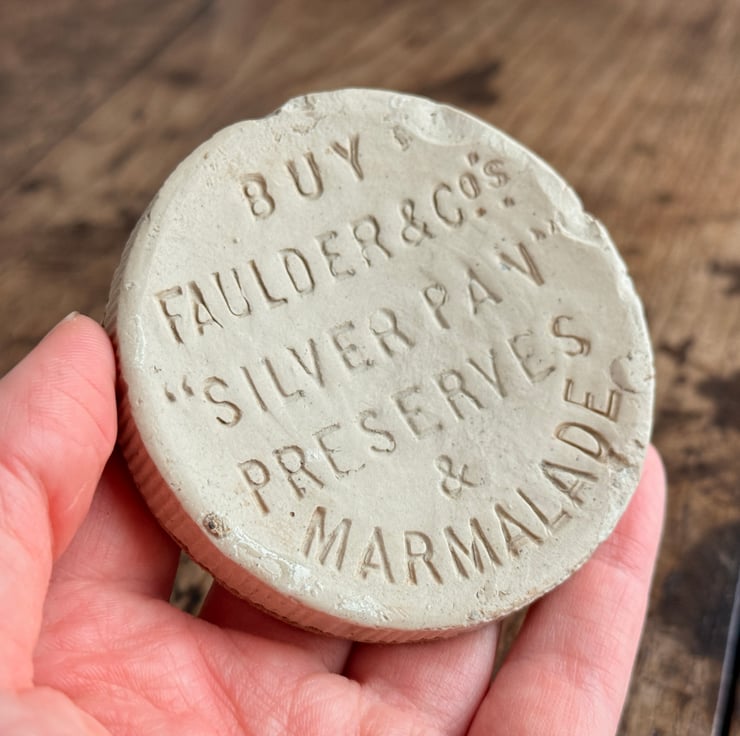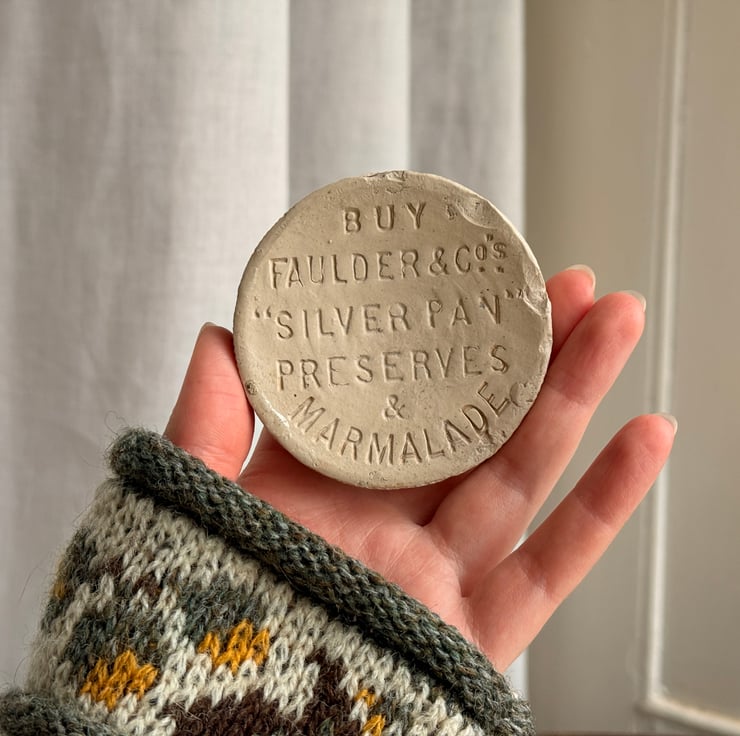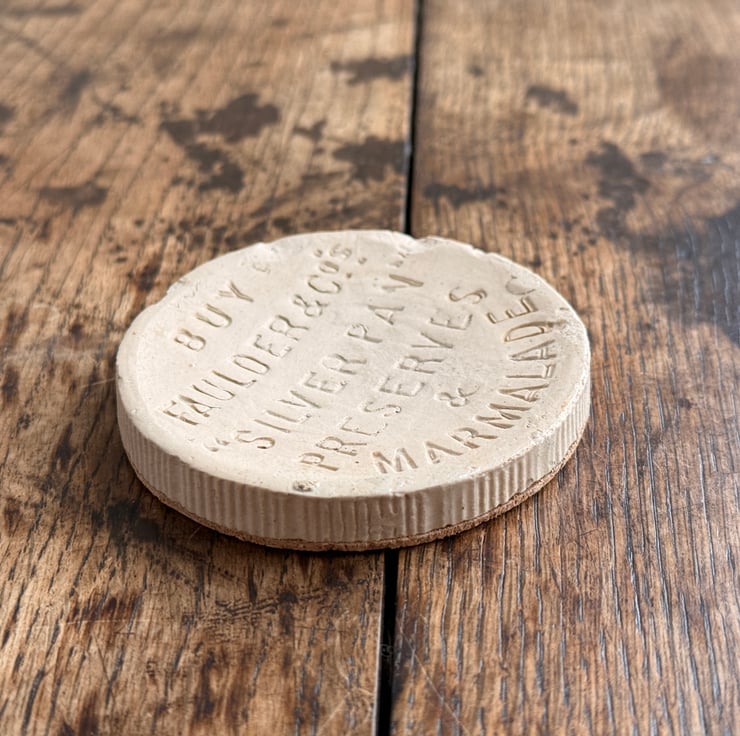 An antique earthenware marmalade jar coaster cut out from the base of a broken marmalade jar. The original jar was found by us during one of our mudlarking adventures! The bottom of the jar base has been fitted with a natural cork layer to protect surfaces.