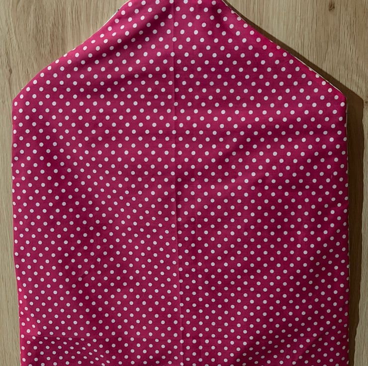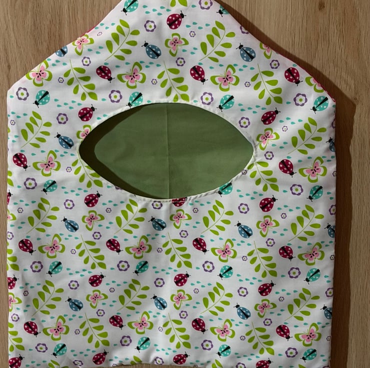 Hand made peg bag made with colourful cotton fabric, this bag has multicoloured ladybirds and butterflies on the front, a plain green inside and pink and white spots on the back, it will enhance any washing line.