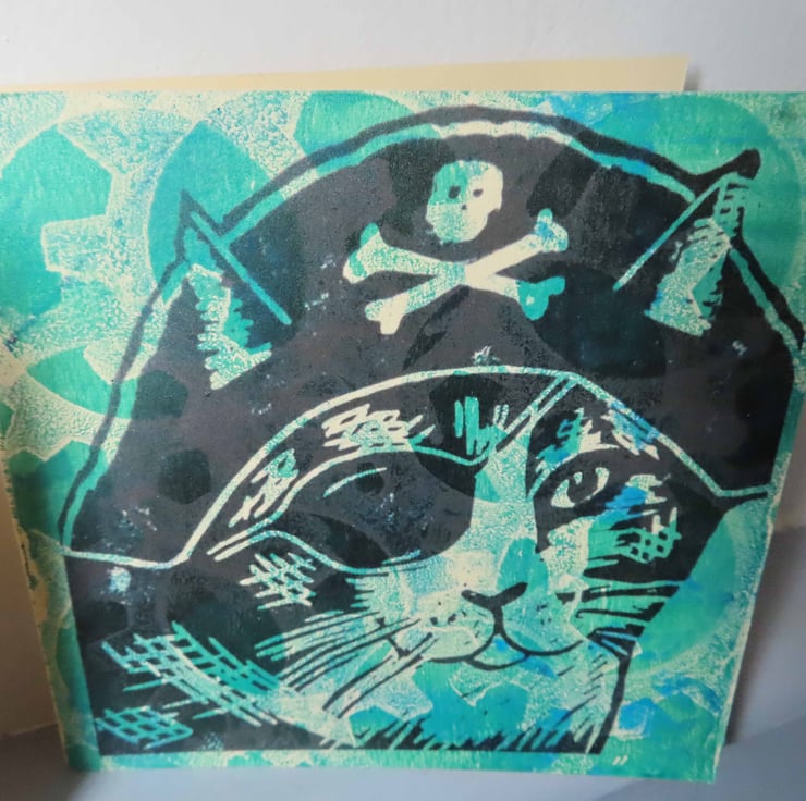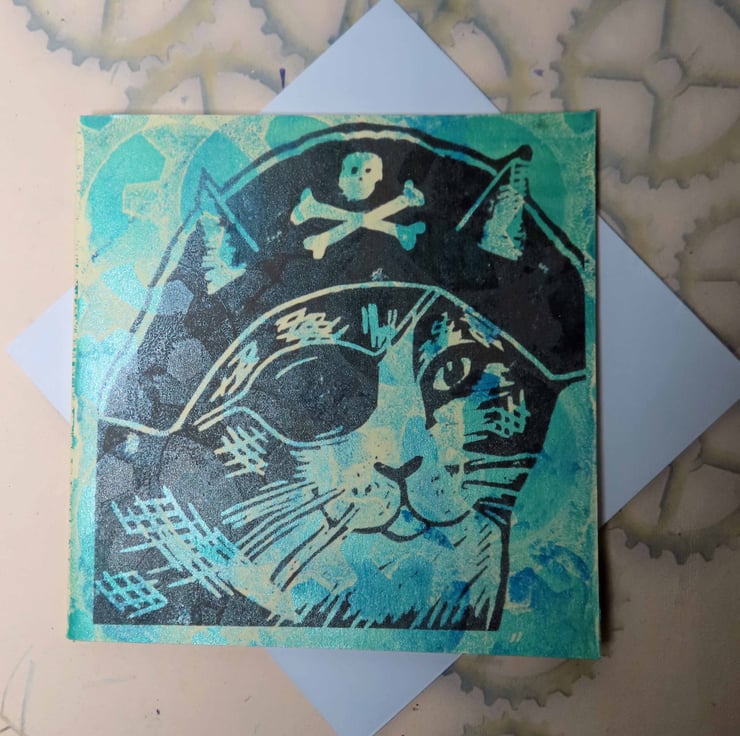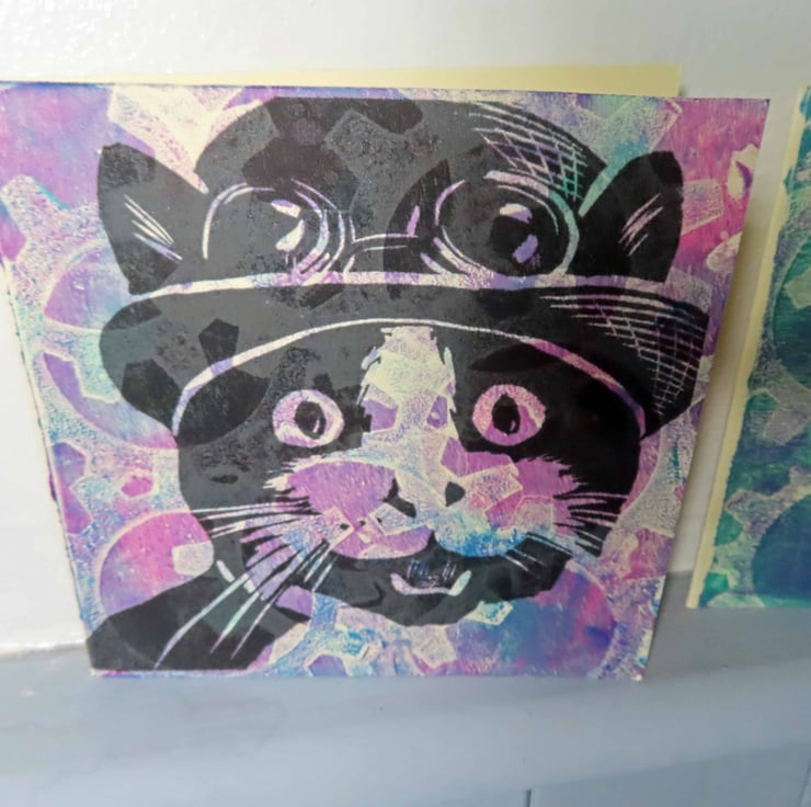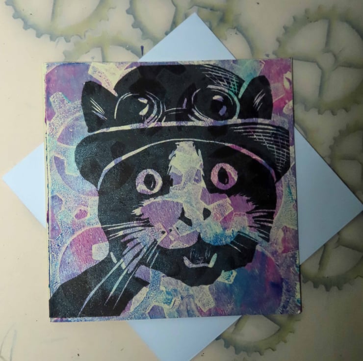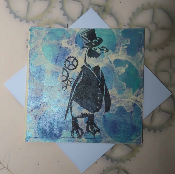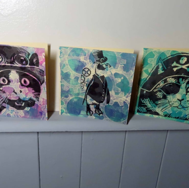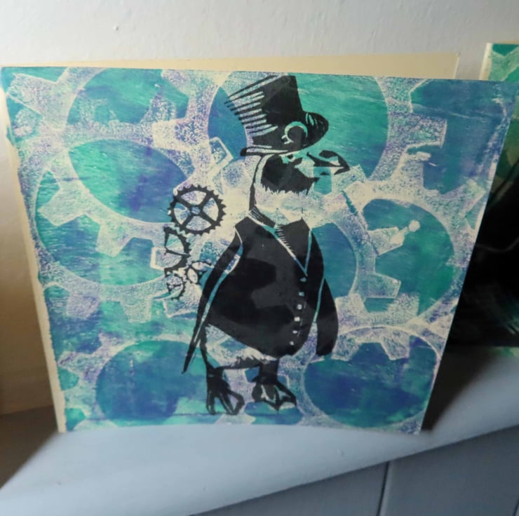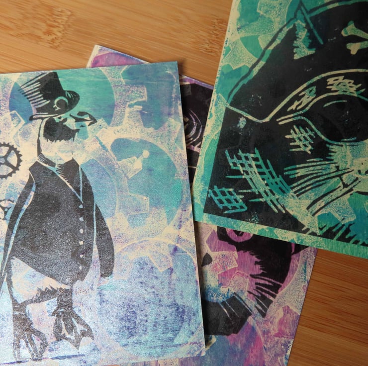 One Off Blank greeting cards gelli printed with Steampunk cogs backgrounds and over printed with images from my original linocut prints.