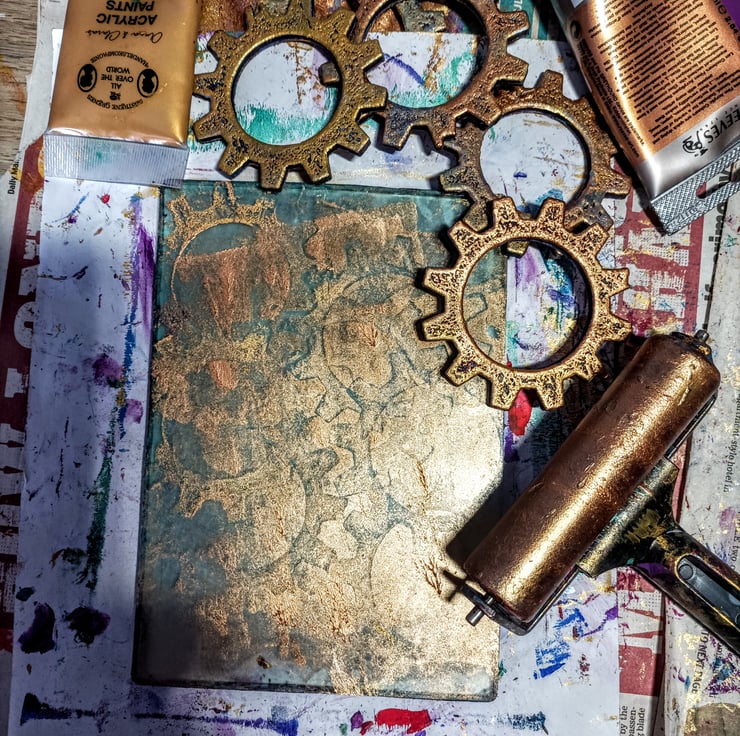 These are printed with multiple layers of textures and cogs in various colours including metallic gold.