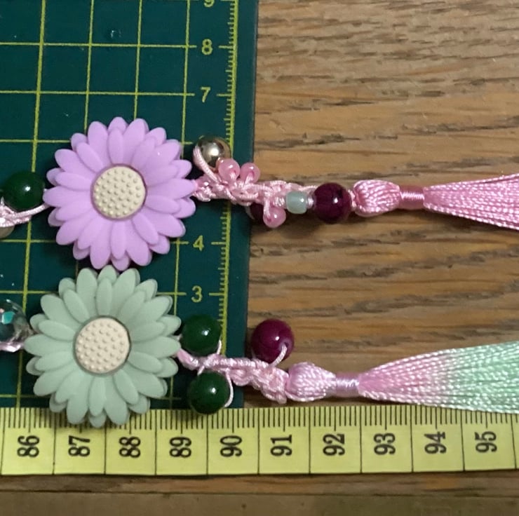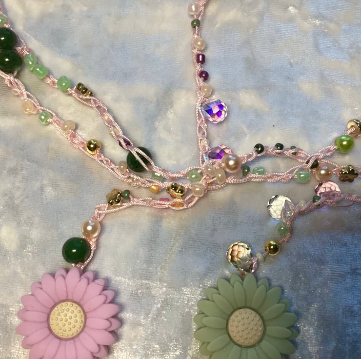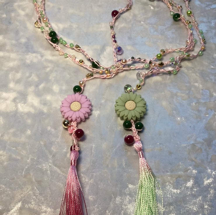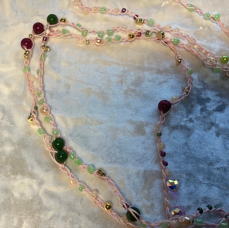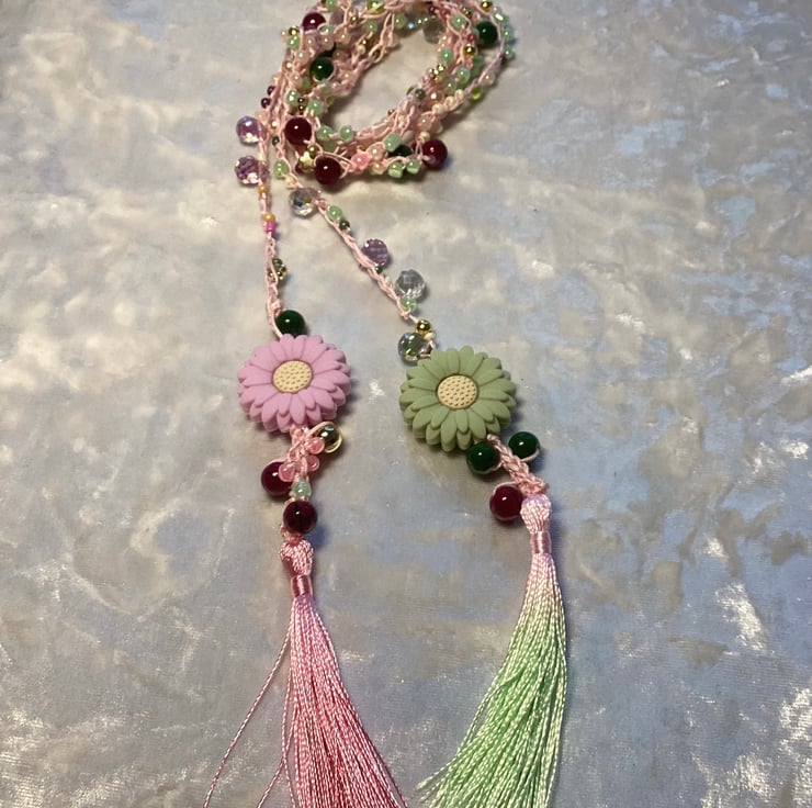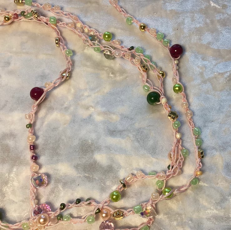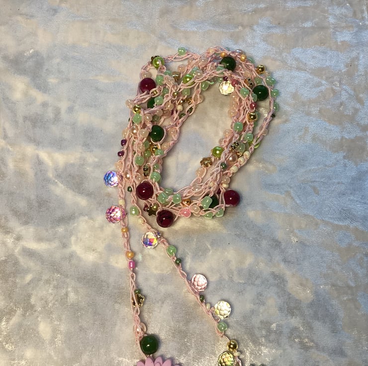 A stunning long crochet beaded necklace made by me in my home studio in West Midlands. I’ve used mix colours beads , czech glass , acrylic ,beads all crochet with woven pink cord. This can be worn many ways! A long necklace, doubled, or even tripled for a layered look. It can also be wrapped around your wrist as a bracelet. Or even used as a belt! Very fun piece of jewellery . Very light and delicate . Measures approx 200 cm . Ive finished with polyester silk tassel and silicone flower beads .