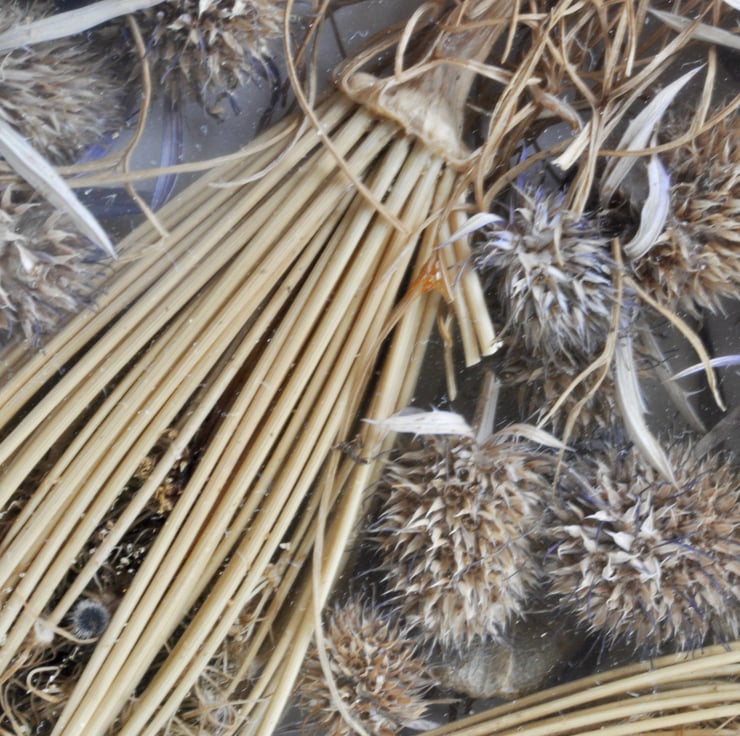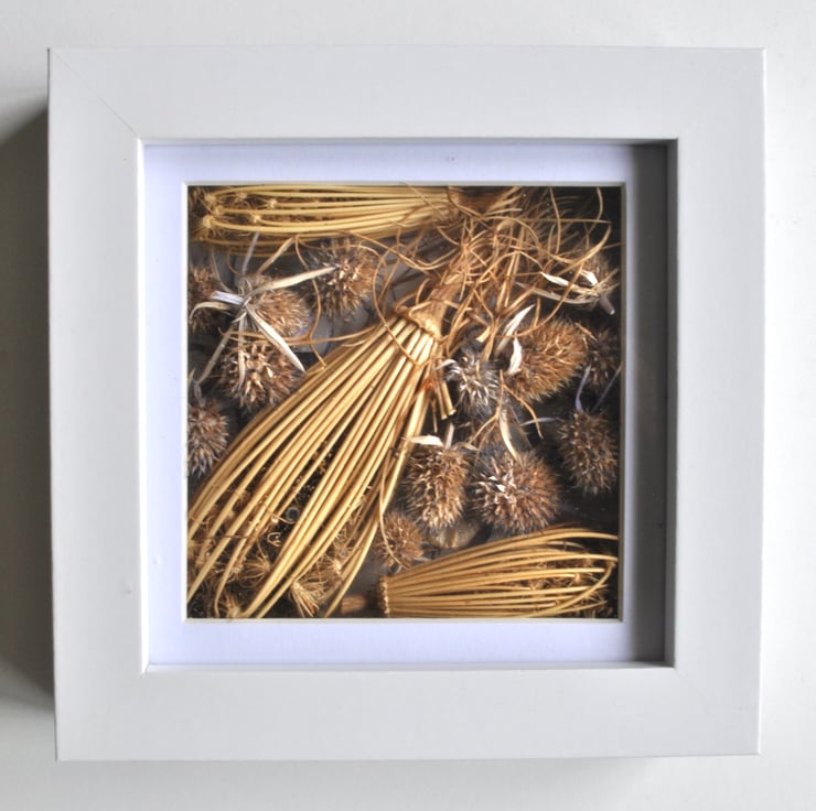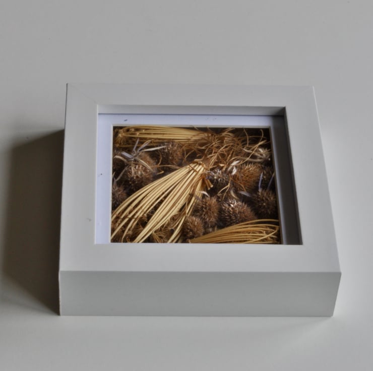 White wooden box frame 12cm x 12cm displaying eryngium and wild carrot seed heads. Hanging loop on back but will also free stand.