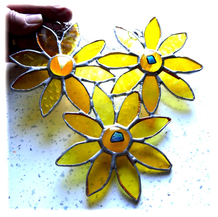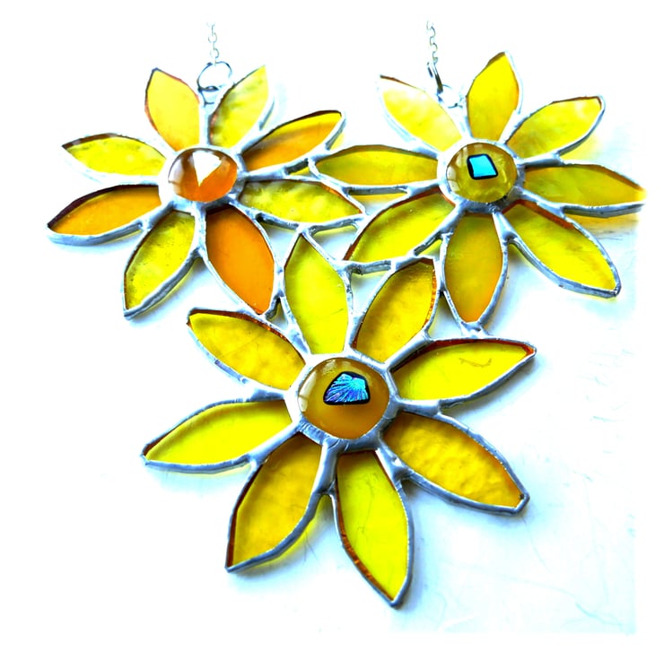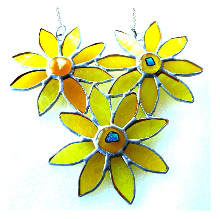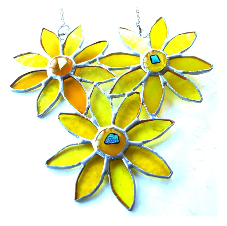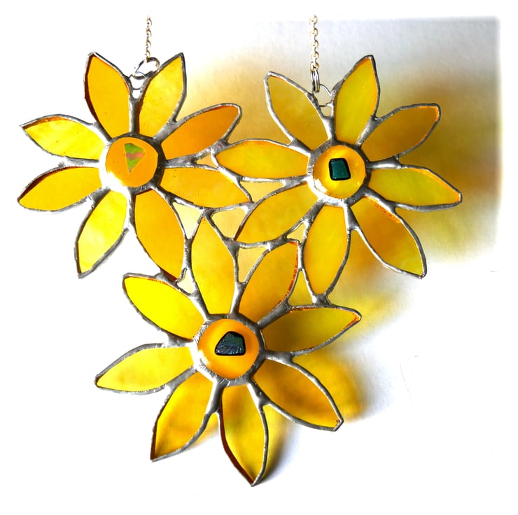Sunflower Stained Glass Suncatcher Trio of Flowers Handmade Yellow