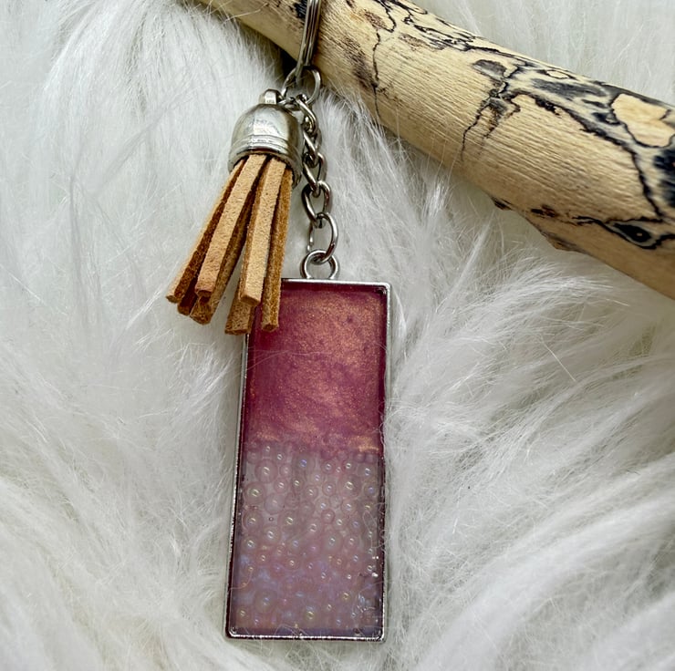 This cute keyring or bag charm has pearlescent resin in pink with miniature bubbles in pearlescent pink and white tones with a complementing tassel.