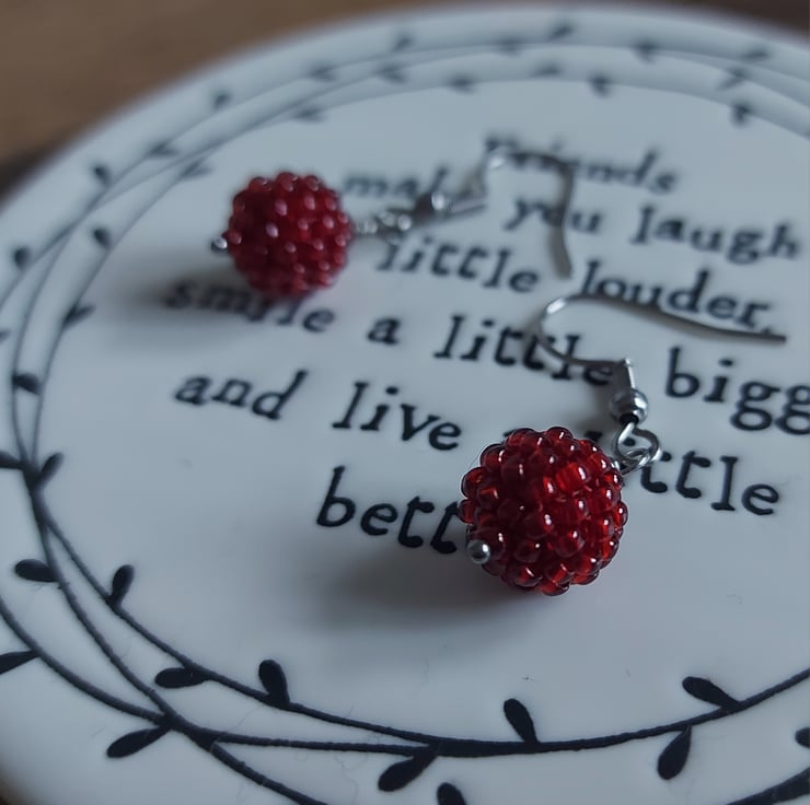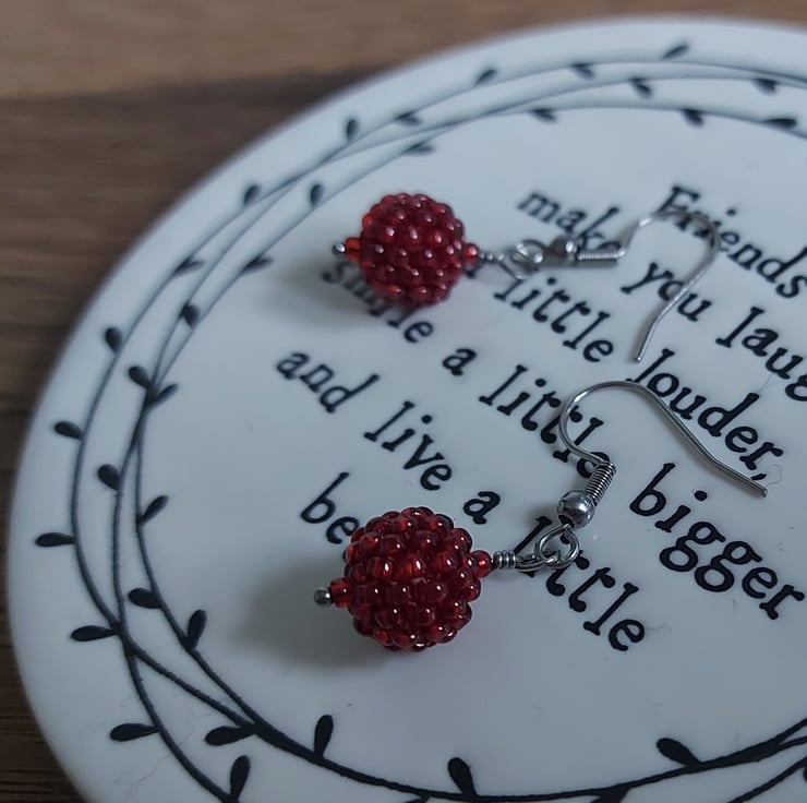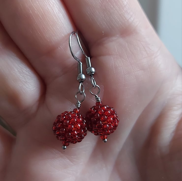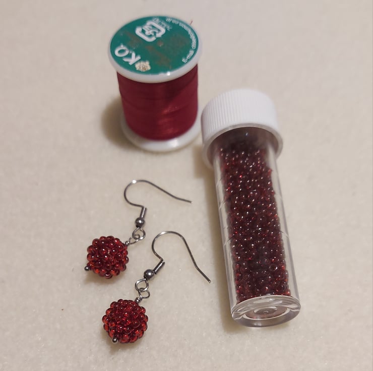 These seed beads are Miyuki, in Garnet Gold Lustre. They look like berries when made into beaded beads! A fruity pop of colour for everyday wear.