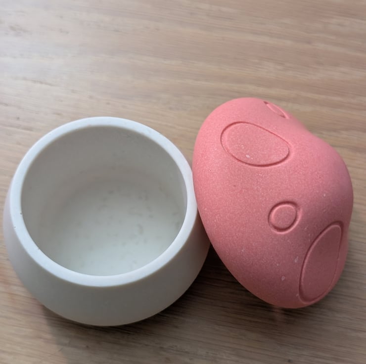 This item is handmade from jesmonite and is intended for decorative and light storage use only. Not suitable for use with food or drink. Handle with care — jesmonite is durable but may chip or break if dropped. Keep out of reach of young children, as small parts or breakage may pose a hazard. Do not use near open flames or extreme heat sources. This item is not a toy. If using to store jewellery or small items, ensure the lid is placed gently to avoid damage.