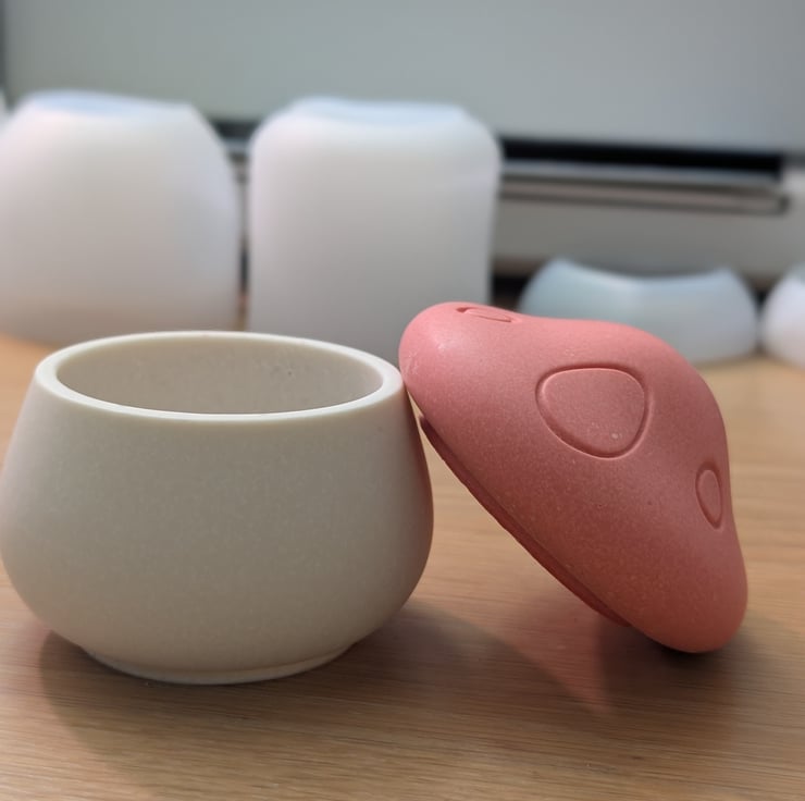 The mushroom-shaped lid came from the idea of shelter and balance. A form that gently covers what’s inside without sealing it away. Nothing hidden, nothing locked. Just held.