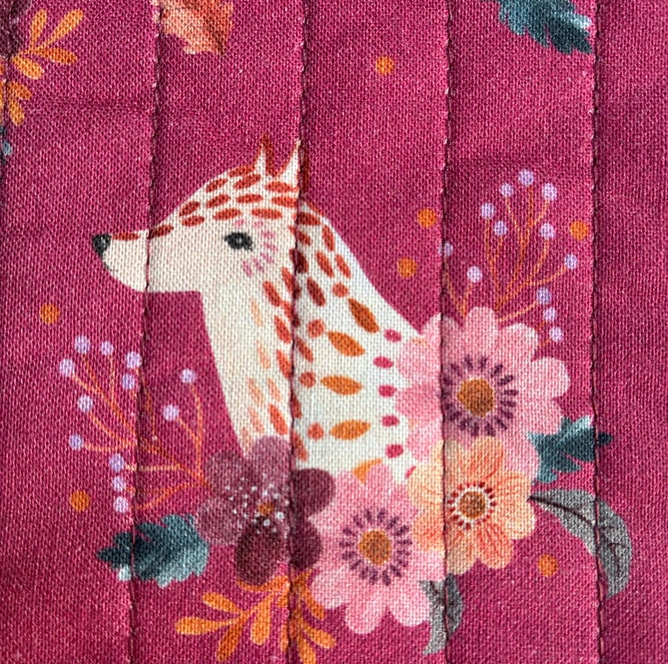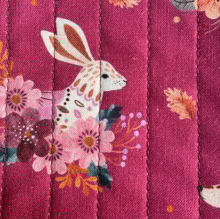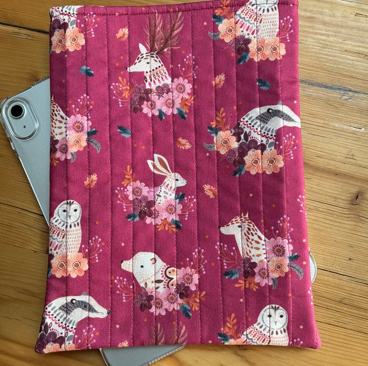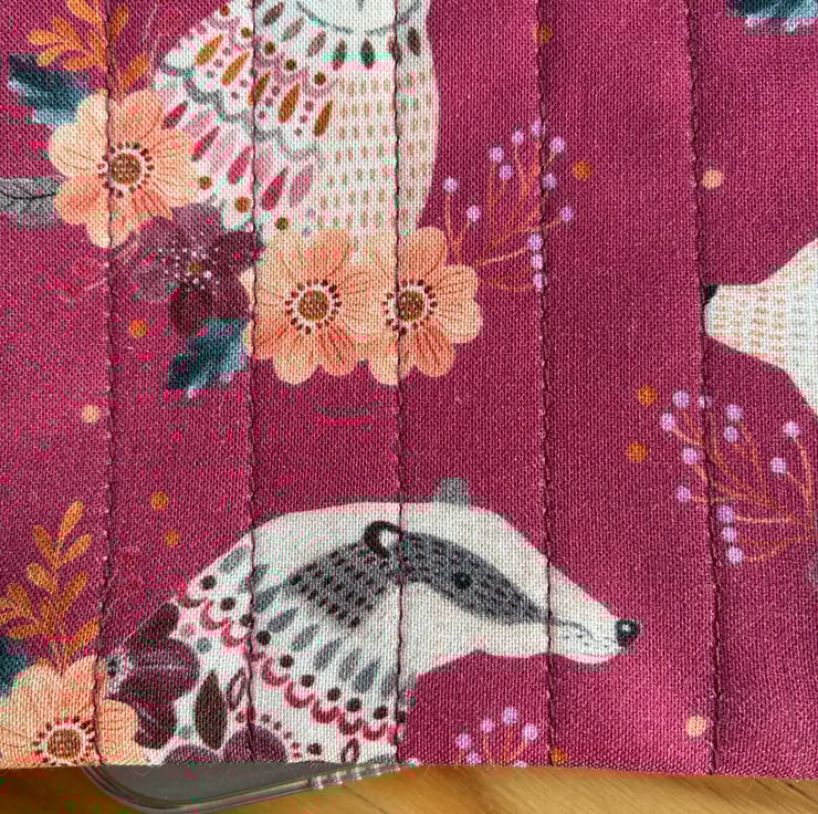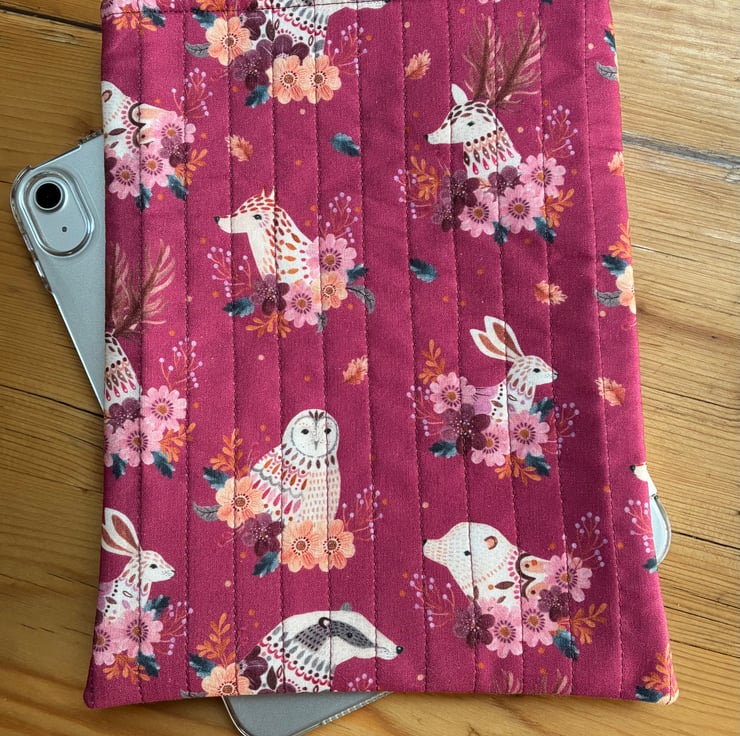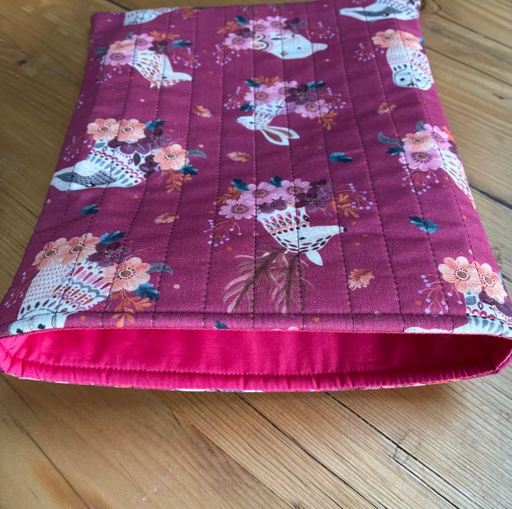 The sleeve is made in this lovely animal head design print featuring bears, owls, rabbits, deer, foxes and badgers. The sleeve is quilted with dusky pink stitching and is fully lined in plain pink cotton fabric.