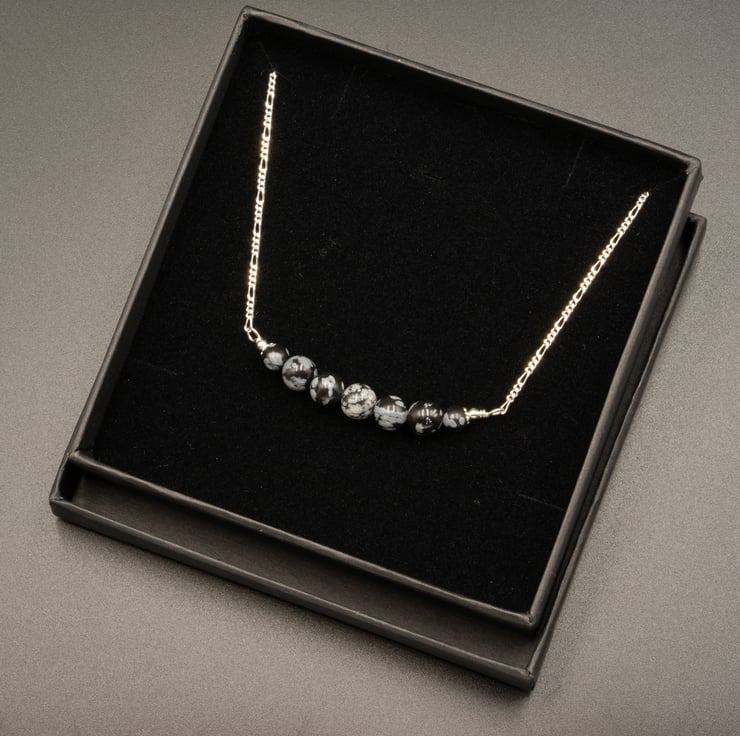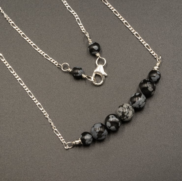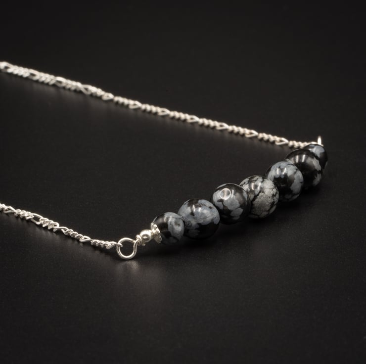 8 - 4mm round snowflake obsidian beads are threaded onto sterling silver wire to form the gemstone bar which hangs from a sterling silver chain with handmade ends using matching 4mm snowflake obsidian beads. The necklace fastens with a sterling silver lobster clasp and handmade ring.